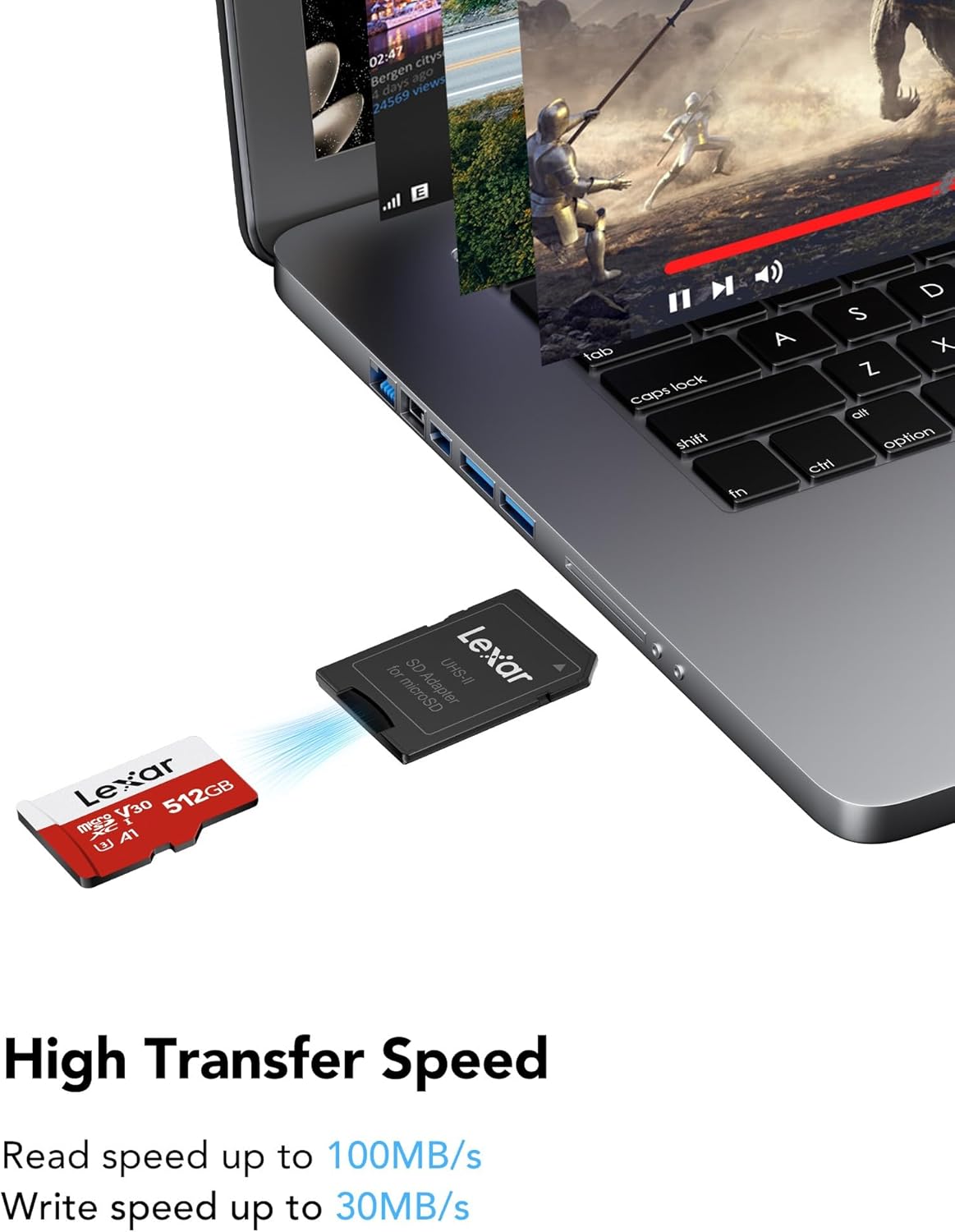 Lexar Micro SD карта 512 GB, Карта памет Micro SD с адаптер, Скорост на четене до 100 MB/s, UHS-I, U3, A1, V30, C10, 4K UHD MicroSDXC SD карта за фотоапарат, смартфон
