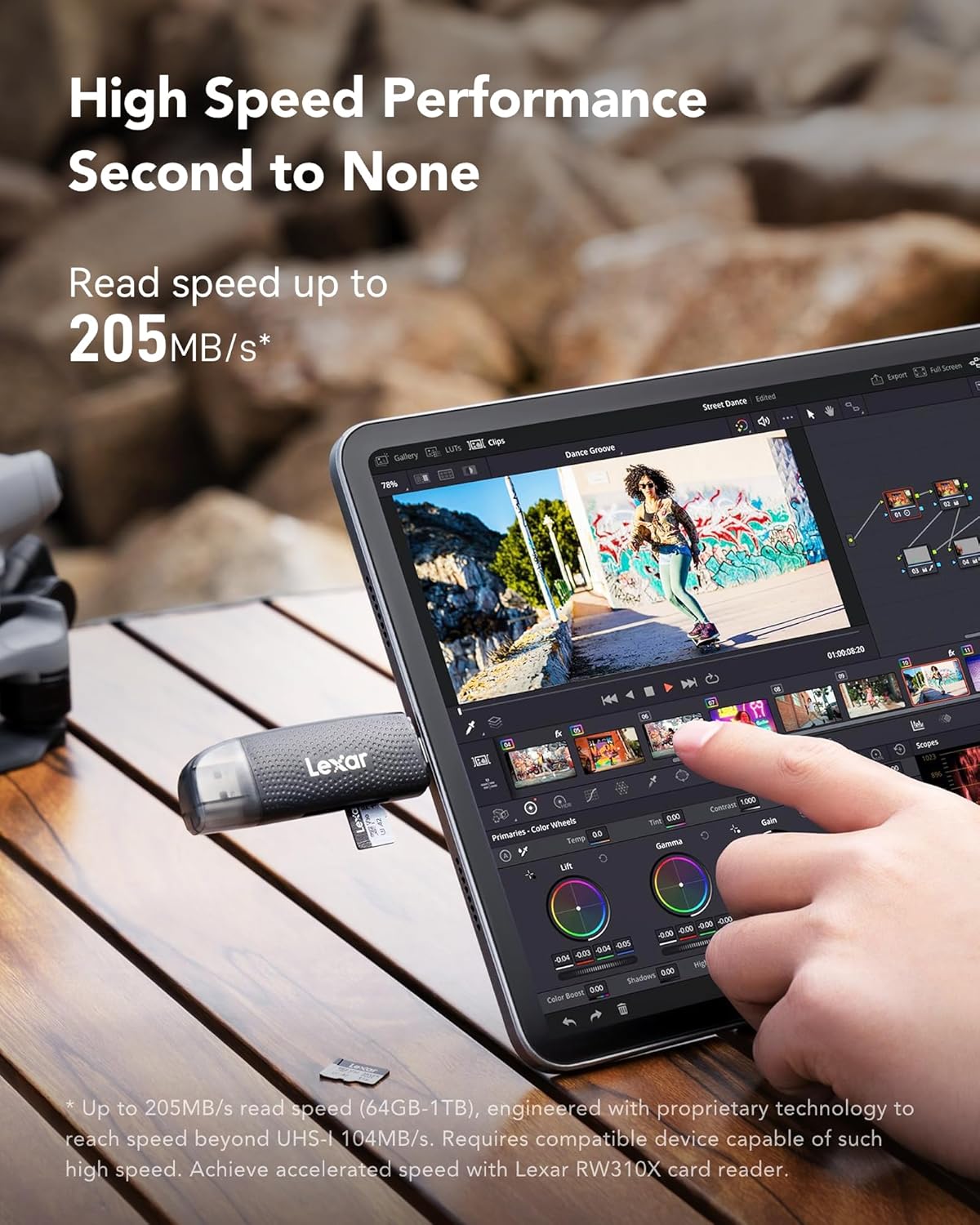 • *Скорост на четене до 205MB/s, разработена със собствена технология за постигане на по-високи скорости от UHS-I 104MB/s. Изисква съвместимо устройство, което може да постигне тази висока скорост. Постигнете тази висока скорост с четеца на карти Lexar RW310X (очаквайте скоро). Скорост на запис до 100MB/s (64GB) Скорост на запис до 150MB/s (128GB-1TB) 1MB = 1000 000 байта.