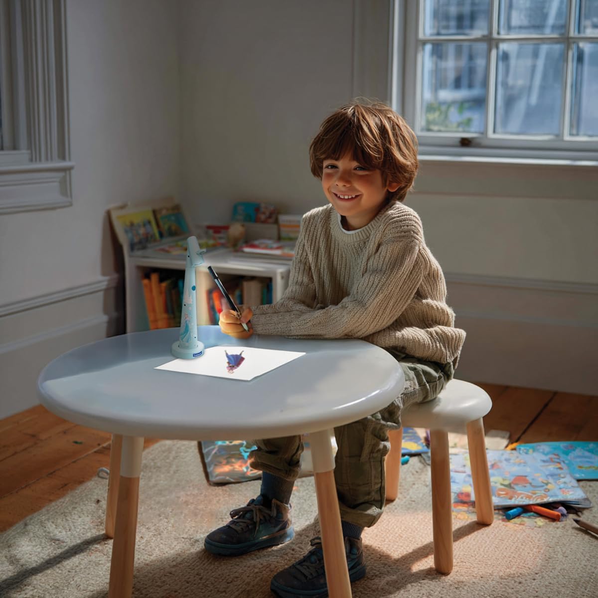 Този проектор за рисуване е идеалният инструмент, който игриво запознава децата с радостта от рисуването. Лесен за употреба: просто включете проектора и поставете един от включените обективи, за да проектирате модел за очертаване.