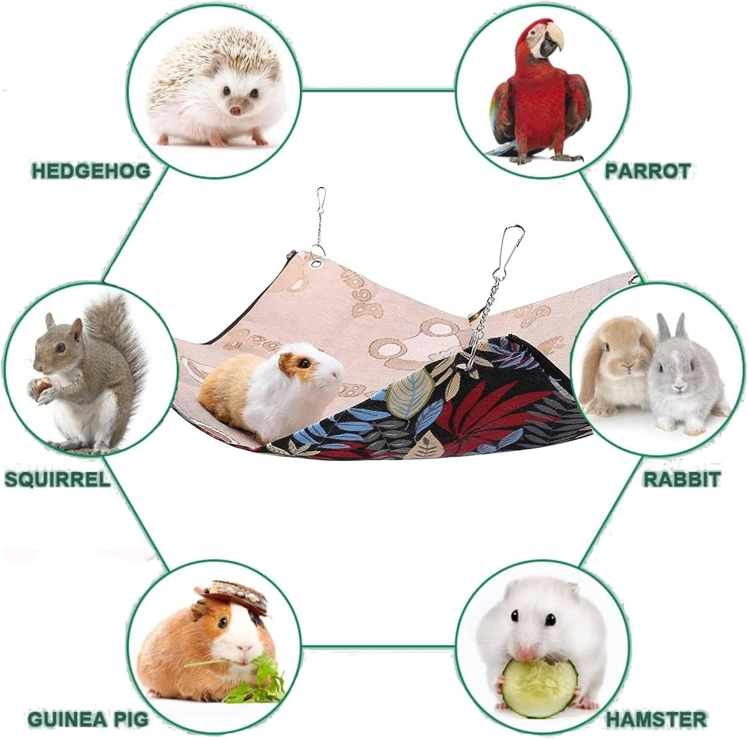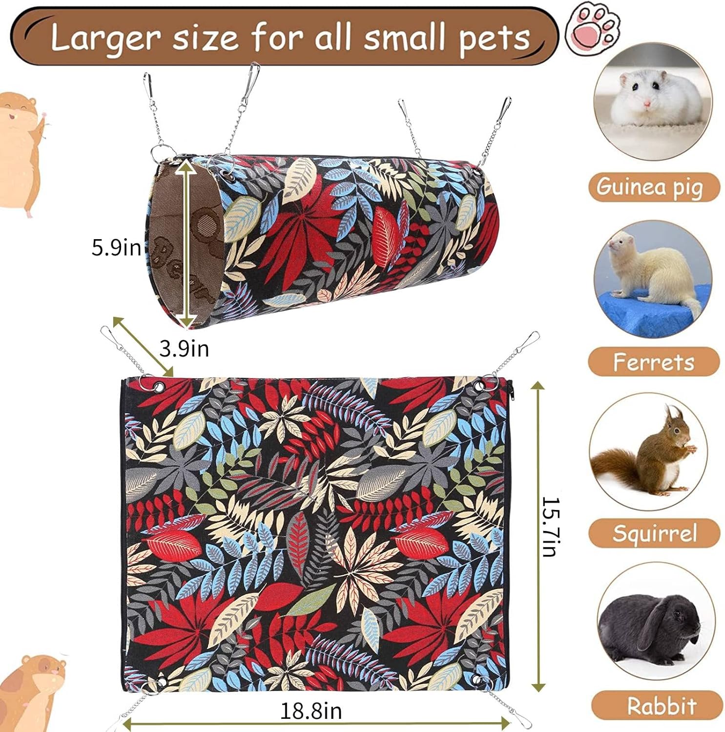 • Подходящи животни: Този размер тунел за морски свинчета е подходящ за хамстери, сирийски хамстери, джербили, захарни планери, плъхове, чинчили, дегу, млади морски свинчета, таралежи, червени катерици, порове, мишки, бурундуци, ара, малки гущери, зайци, корели, птици и др. Аксесоарите за морски свинчета са супер удобно място за почивка и могат да се използват за домашни любимци. Пазете от студа, което е полезно за здравето.