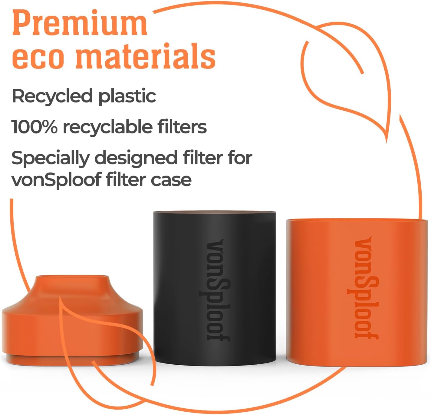 Личният въздушен филтър VonSploof използва издръжливи, сменяеми HEPA филтърни касети в опаковка от 3. Всеки филтър Sploof е достатъчен за над 500 димоотвода, а всички филтри и опаковки са 100% хартиени.