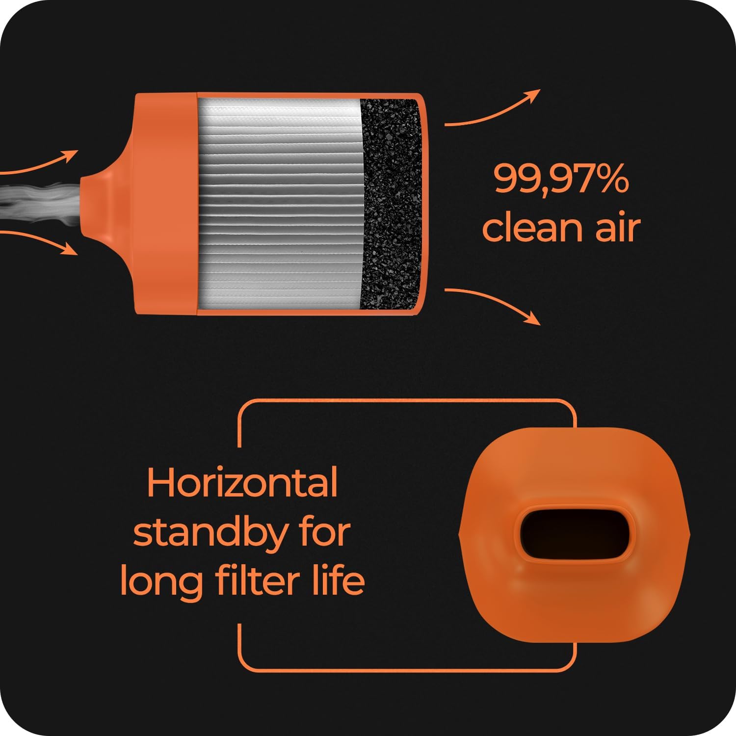 Личният въздушен филтър ефективно почиства над 500 вдишвания.