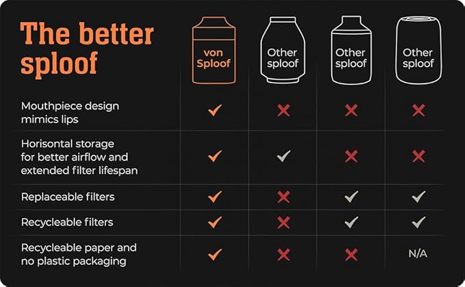 Със своята здрава конструкция от рециклирана пластмаса и издръжливи, сменяеми филтри без пластмаса, Sploof е основен аксесоар за пушене, който поддържа въздуха без миризми на дим, като същевременно подхожда на всеки стил и облекло.