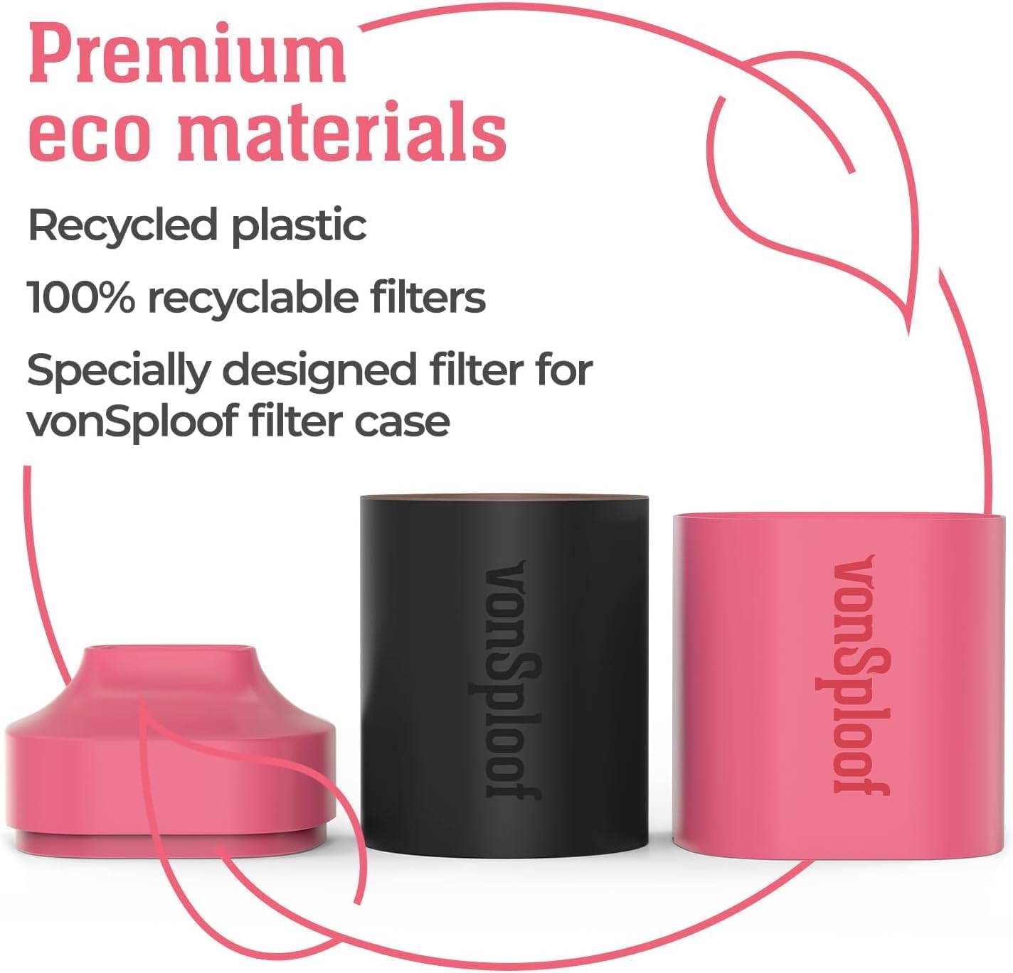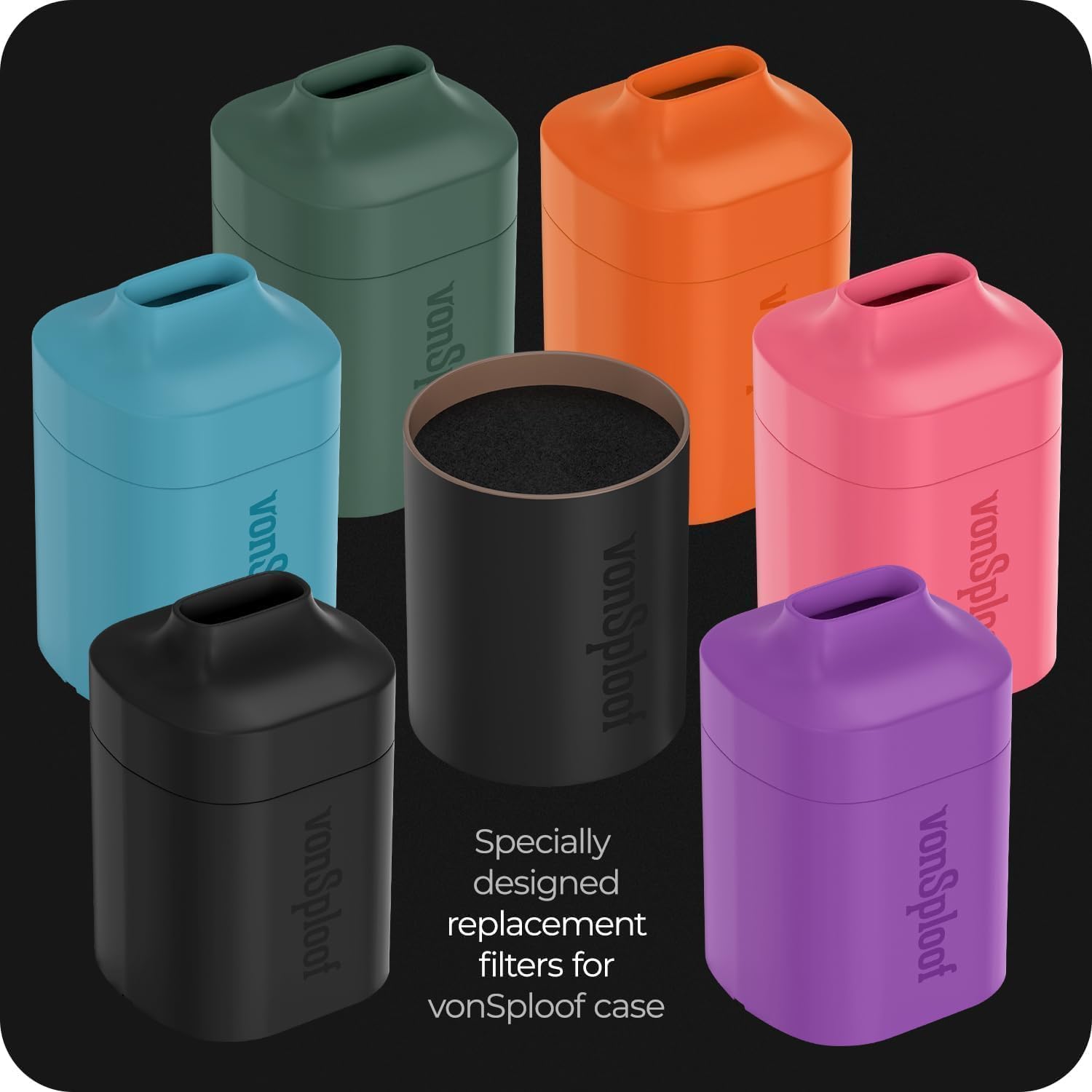 Личният въздушен филтър VonSploof използва издръжливи, сменяеми HEPA филтърни касети в опаковка от 3. Всеки филтър Sploof е достатъчен за над 500 димоотвода, а всички филтри и опаковки са 100% хартиени.