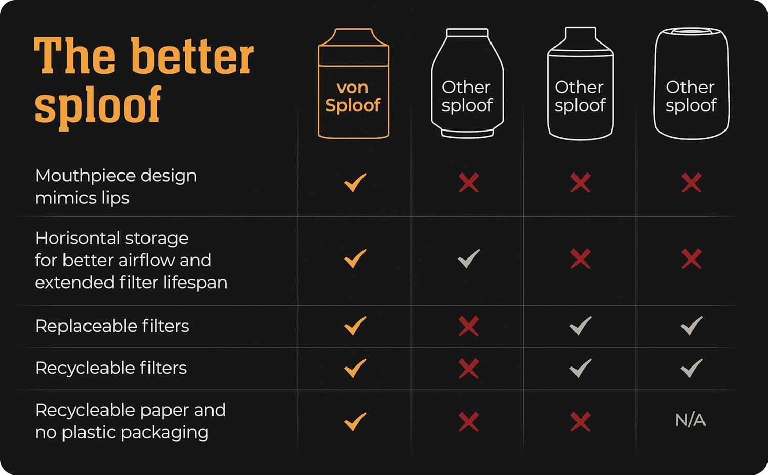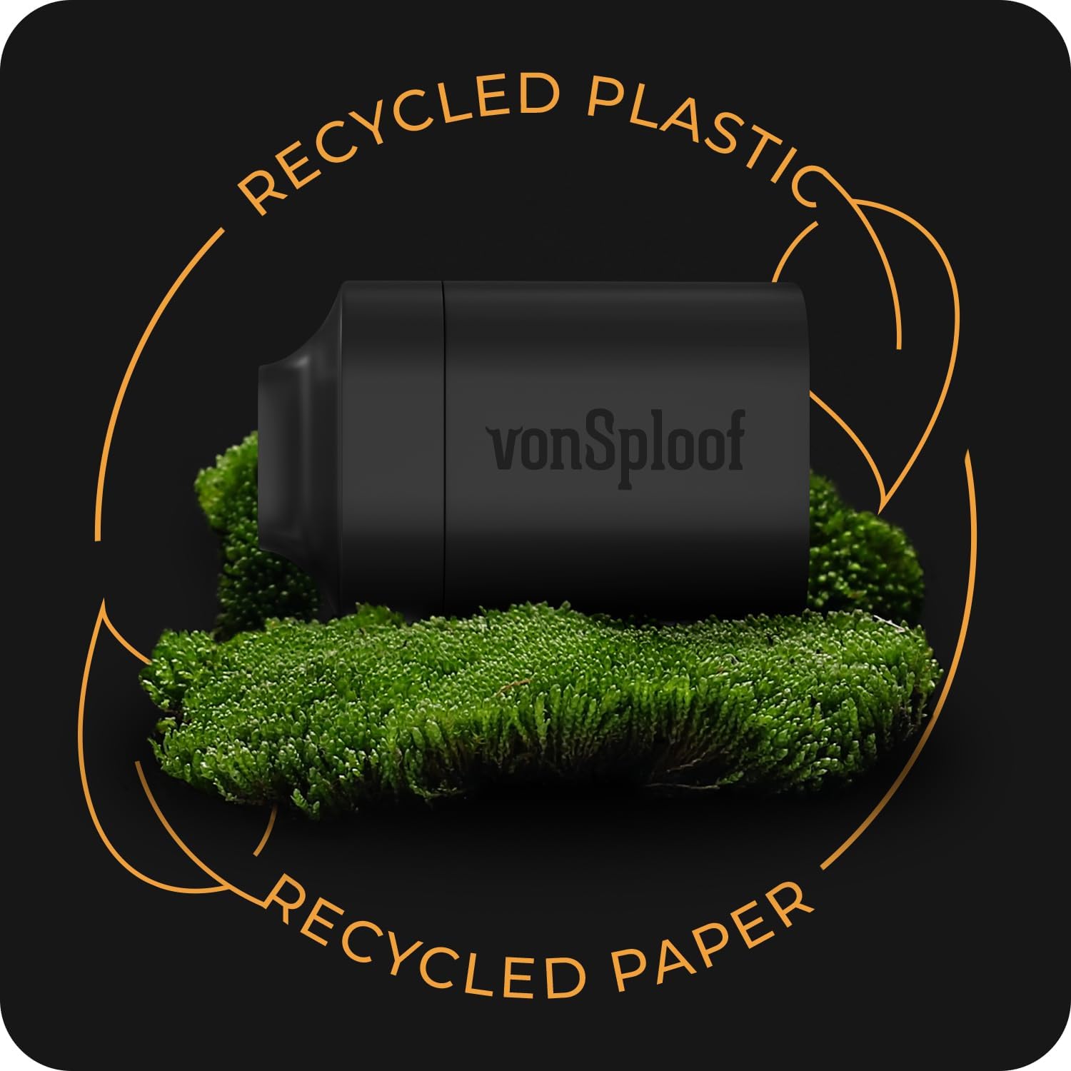 Със своята здрава конструкция от рециклирана пластмаса и издръжливи, сменяеми филтри без пластмаса, Sploof е основен аксесоар за пушене, който поддържа въздуха без миризми на дим, като същевременно подхожда на всеки стил и облекло.