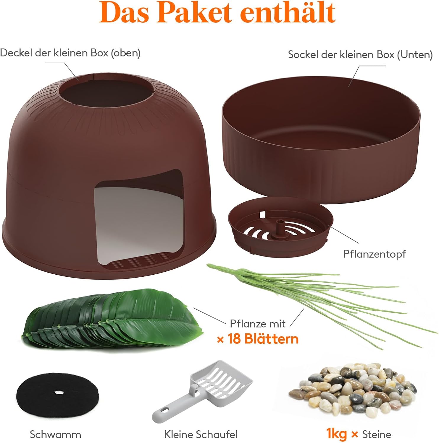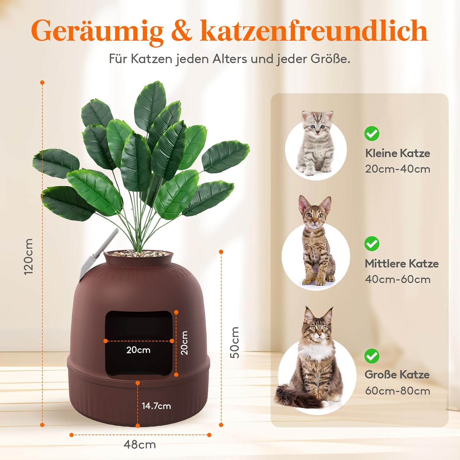 • Скрита котешка тоалетна: Нашата скрита котешка тоалетна се слива безпроблемно с вашата жилищна среда, маскирана като истинска саксия за цветя. С подобрена височина от 70 см, тя предлага достатъчно място за котки от всякакви размери, домакинства с много котки и други малки домашни любимци. Внимателно аранжираната декорация от 18 големи изкуствени растения и камъчета подобрява визията, добавя нотка елегантност към вашето жилищно пространство и повишава естетическата стойност на вашия дом.