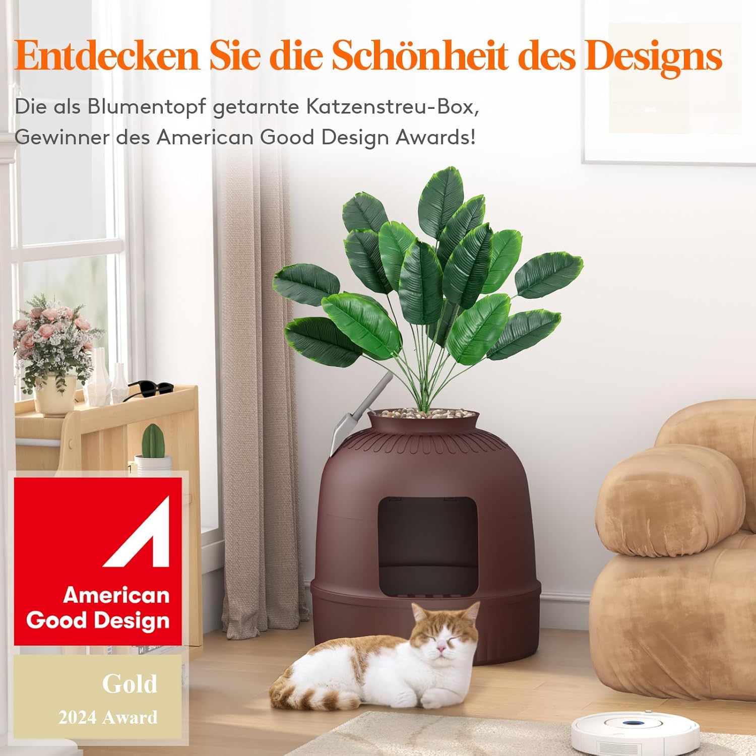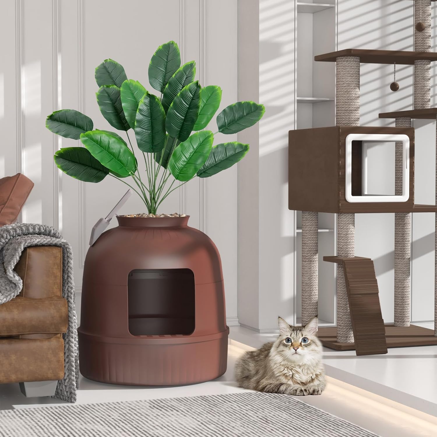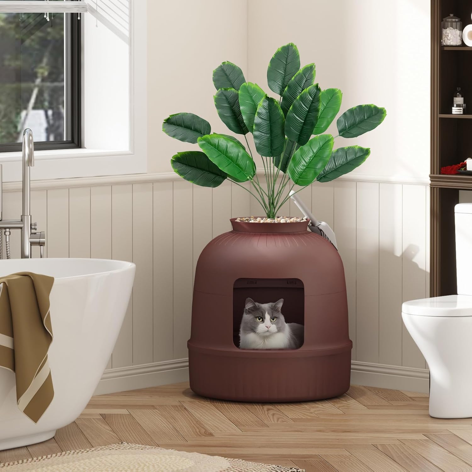 Lifewit Котешка тоалетна с изкуствено растение и лъжичка за големи котки, скрита котешка тоалетна с контрол на миризмата и филтър с активен въглен за хол/спалня/баня, кафява