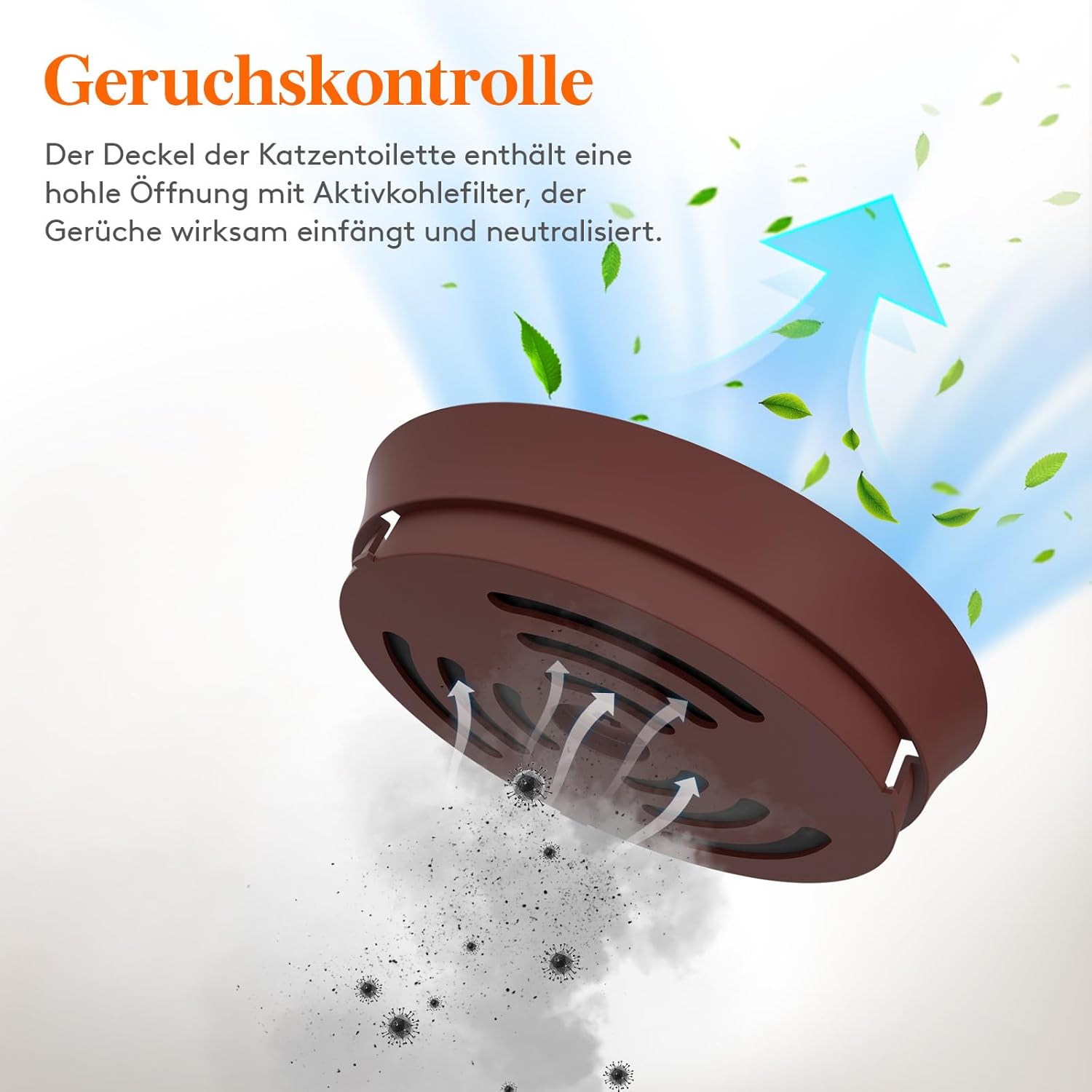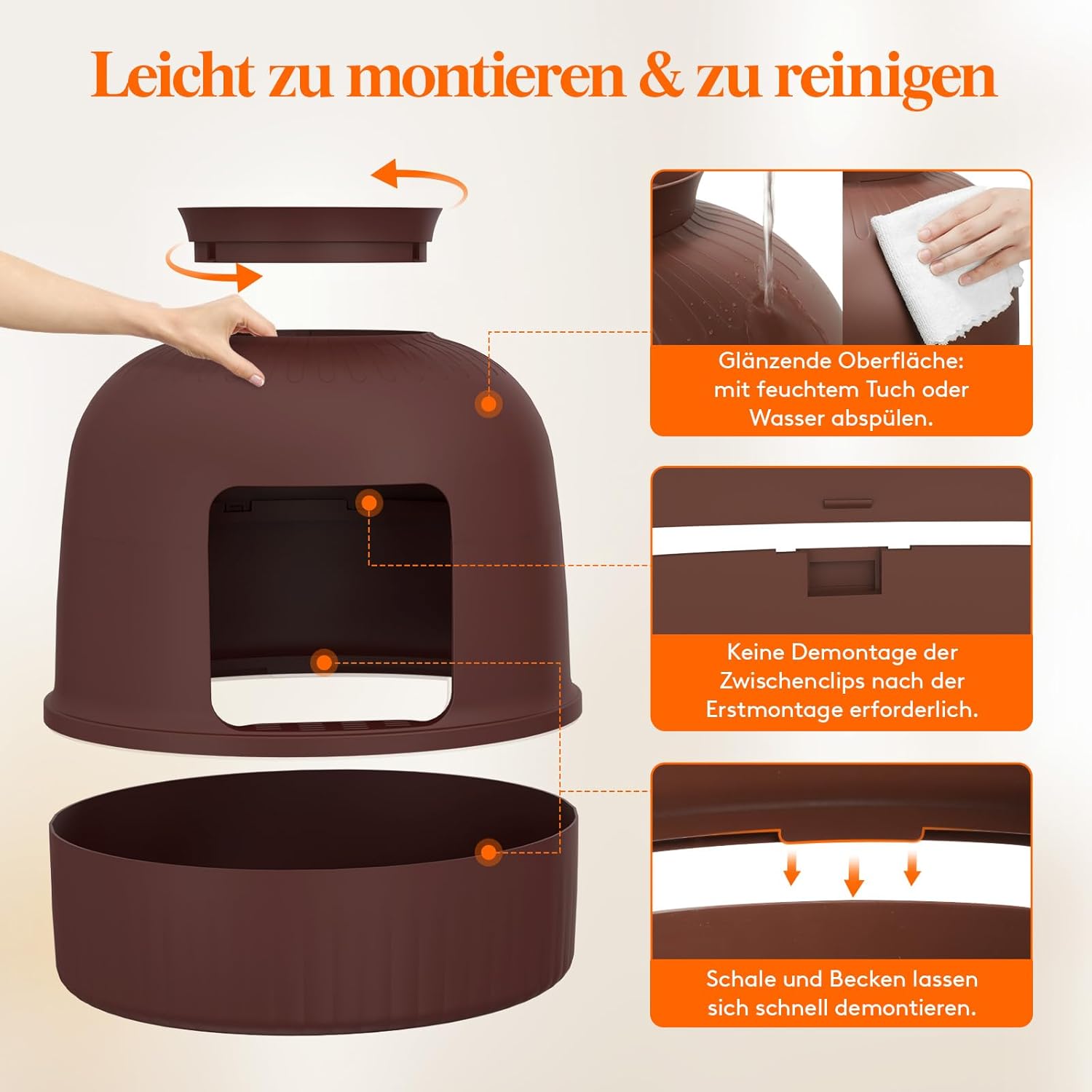 • Лесен монтаж и почистване: Долната обвивка и долният леген са зашити. Тази удобна за потребителя функция улеснява свалянето и сглобяването на приставката при почистване на котешка тоалетна и предотвратява попадането на фекалии в процепите. Блестящата повърхност както отвътре, така и отвън не само придава на продукта нотка красота, но и го прави лесен за почистване.