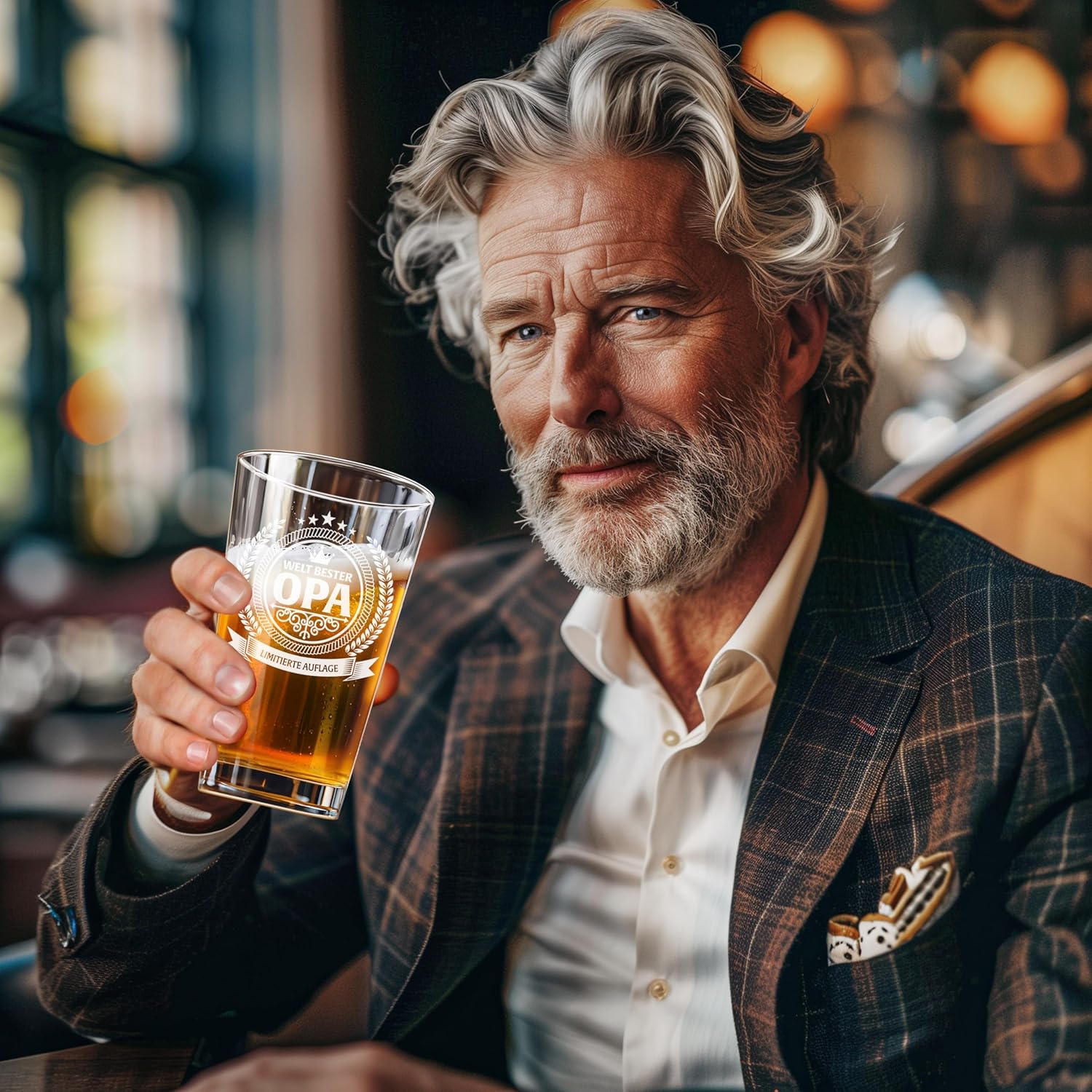 Das Papa-Pintglas hat dicke Seiten und ein solides Bodendesign, es ist langlebig und bruchfest. Das große Fassungsvermögen von 480 ml ist ideal für Ihre Lieblingsgetränke wie Bier, Whisky, IPA, Wasser, Saft und andere Getränke.