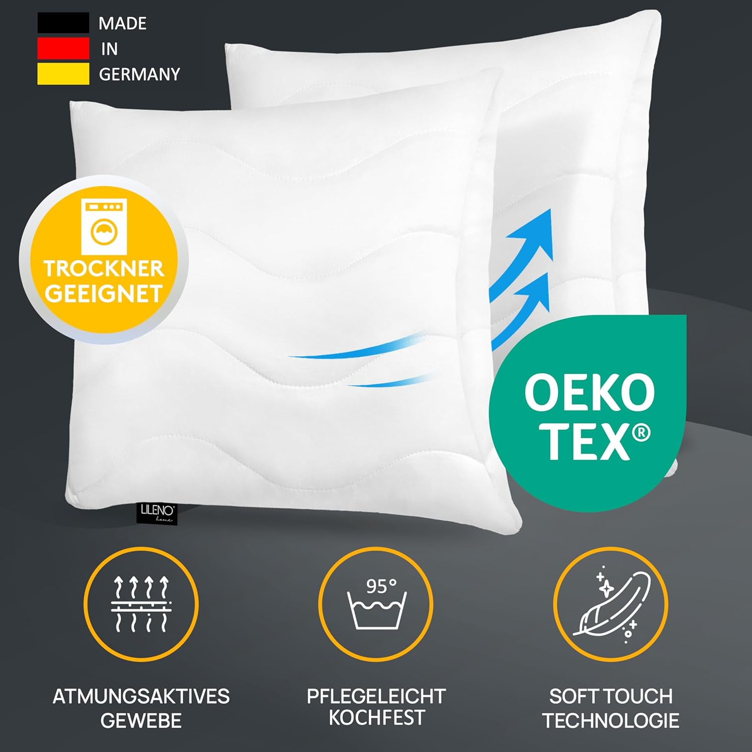 • Произведено в Германия: в LILENO HOME ние отдаваме голямо значение на качеството. Всички наши пълнени възглавници са произведени в Германия и както полиестерният калъф, така и полиестерният пълнеж преминават през щателен контрол на качеството.
