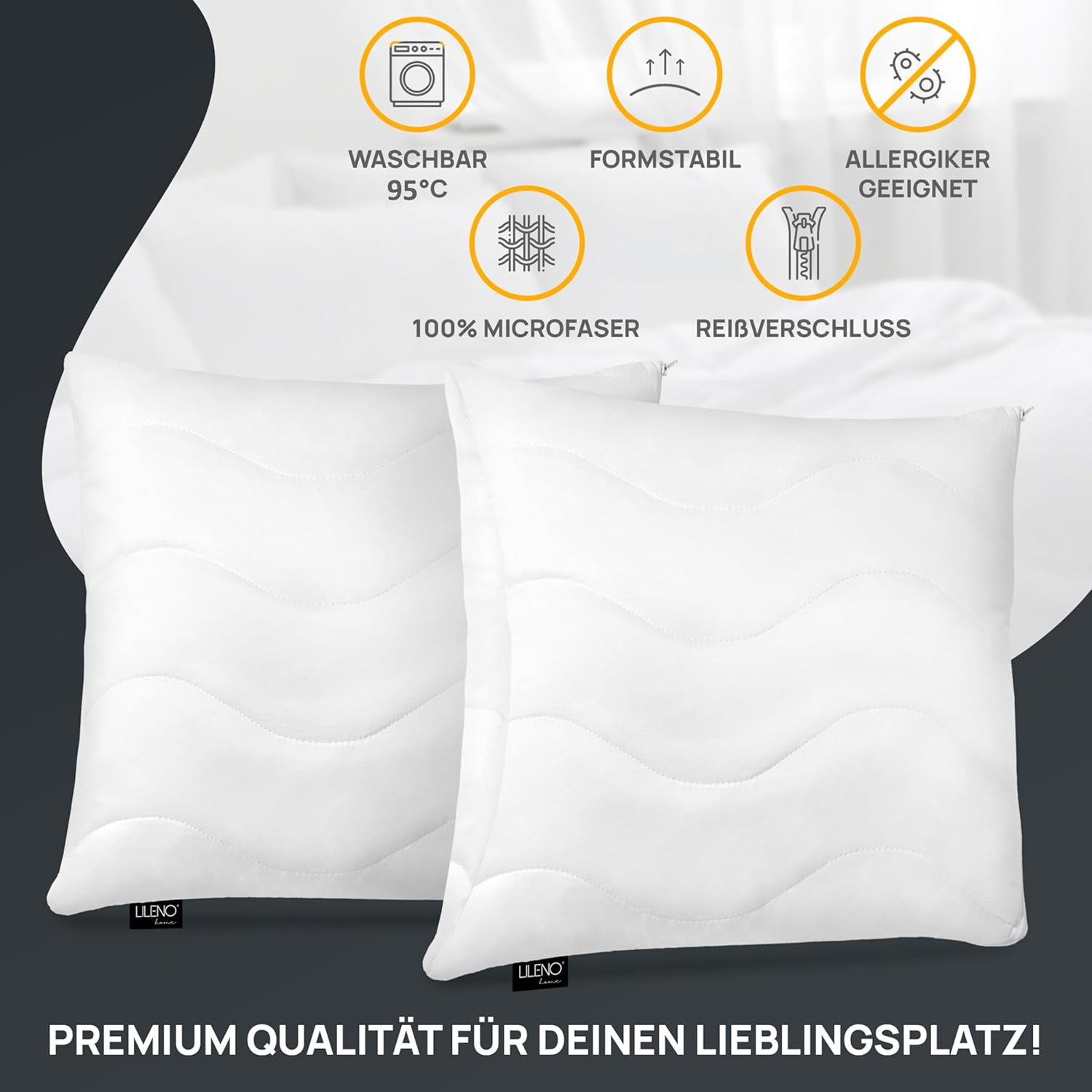 • Подходящо за хора с алергии: Нашите възглавници, сертифицирани по Oeko-Tex 100, могат да се перат на 95°C и са тествани за вредни вещества. Висококачествените и удобни вълнообразни шевове също са изработени от хипоалергенен микрофибър.