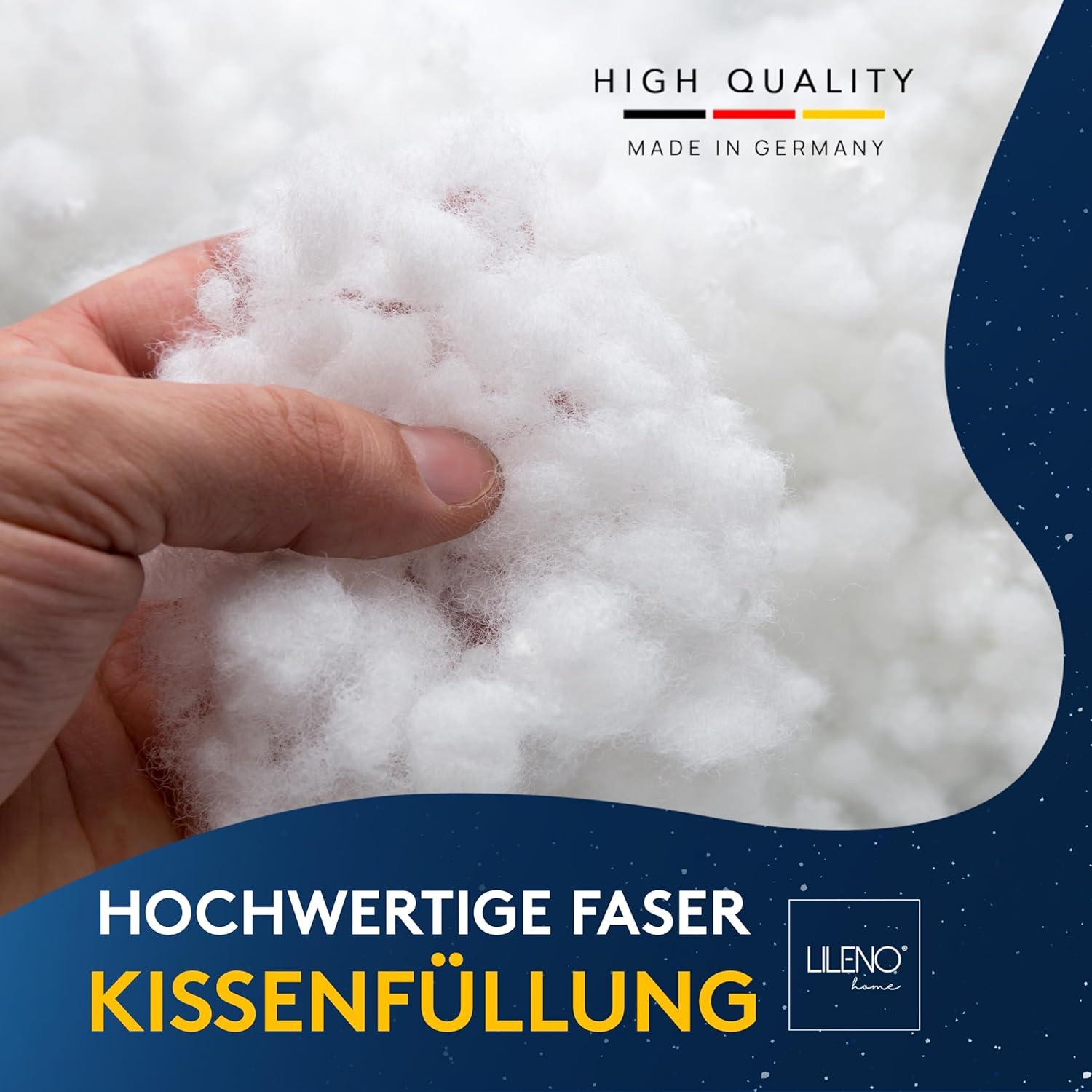 • Произведено в Германия: в LILENO HOME ние отдаваме голямо значение на качеството. Всички наши пълнени възглавници са произведени в Германия и както полиестерният калъф, така и полиестерният пълнеж преминават през щателен контрол на качеството.