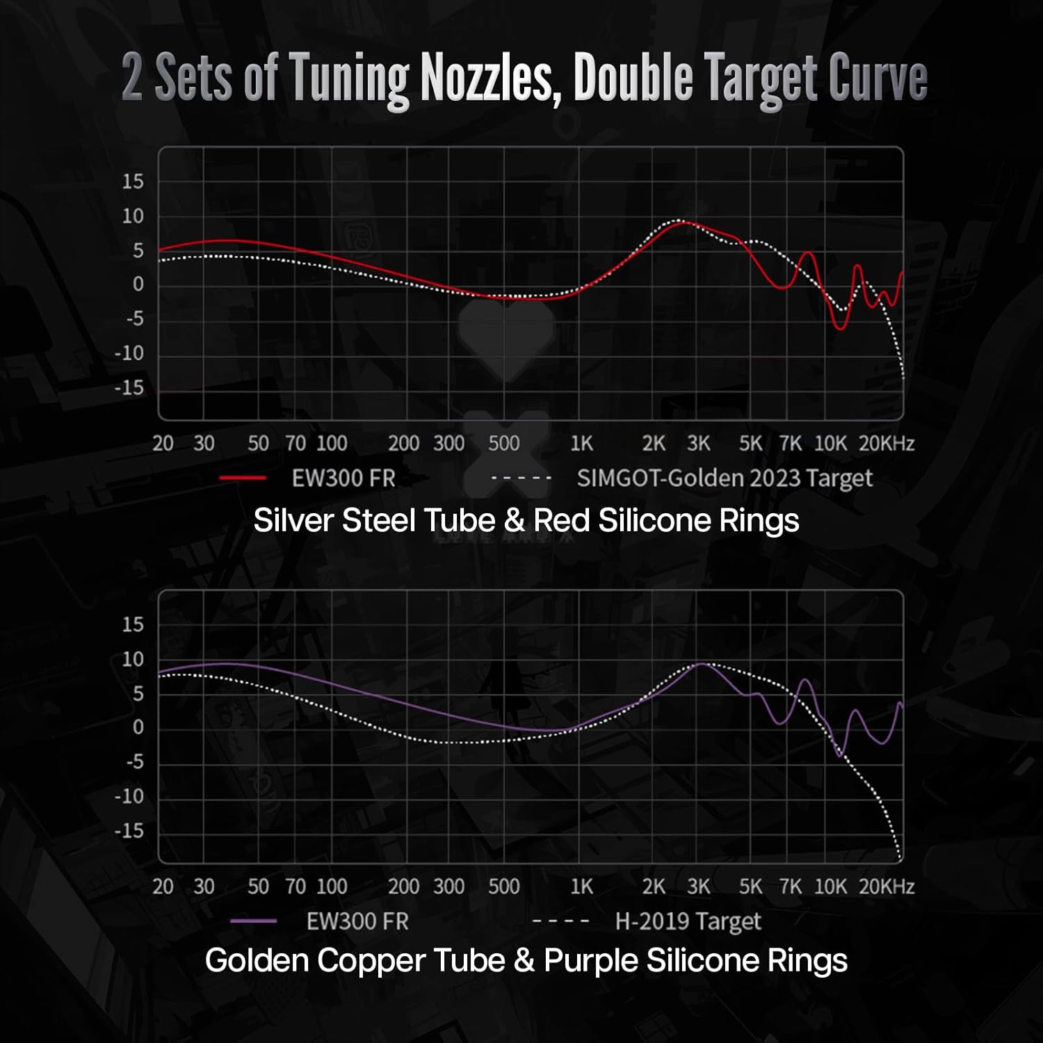 • Лесен за употреба: EW300 предлага сменяем дизайн на дюзите с два различни типа настройка. Всеки комплект дюзи е оборудван с уникални системи и техники за настройка. Иновативната резбова връзка позволява бърза и лесна смяна на дюзите, което позволява на потребителя без усилие да превключва между различни музикални стилове. С персонализирани опции за звук, EW300 предлага две първокласни опции за настройка, базирани на целевите криви SIMGOT-Golden2023 и H-2019.