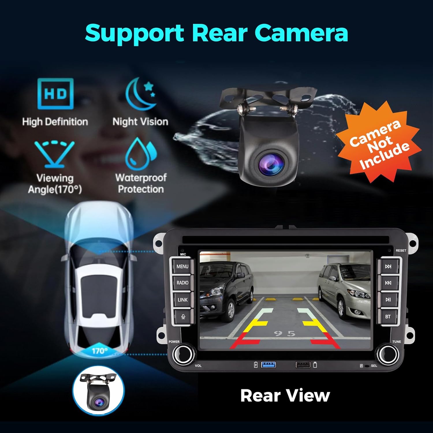 • Поддържа вход за изображение от AHD/CCD камера за заден ход: След като устройството е свързано, то автоматично показва изображение от заден ход при движение на заден ход. Така можете да засечете опасности като домашни любимци, играещи деца или пощенски кутии зад автомобила. Съвместимо е с CANbus и дистанционното управление на оригиналния автомобил, което улеснява управлението на автомобилното радио по време на шофиране.