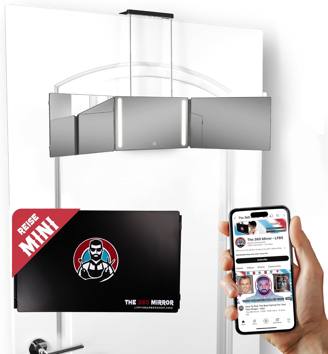 LIPFISBARBERSHOP.COM 360-градусово огледало - Регулируеми телескопични куки - Огледало за самостоятелно подстригване за мъже - Тройно огледало за подстригване - Огледало за самостоятелно подстригване - Огледало за самостоятелно подстригване