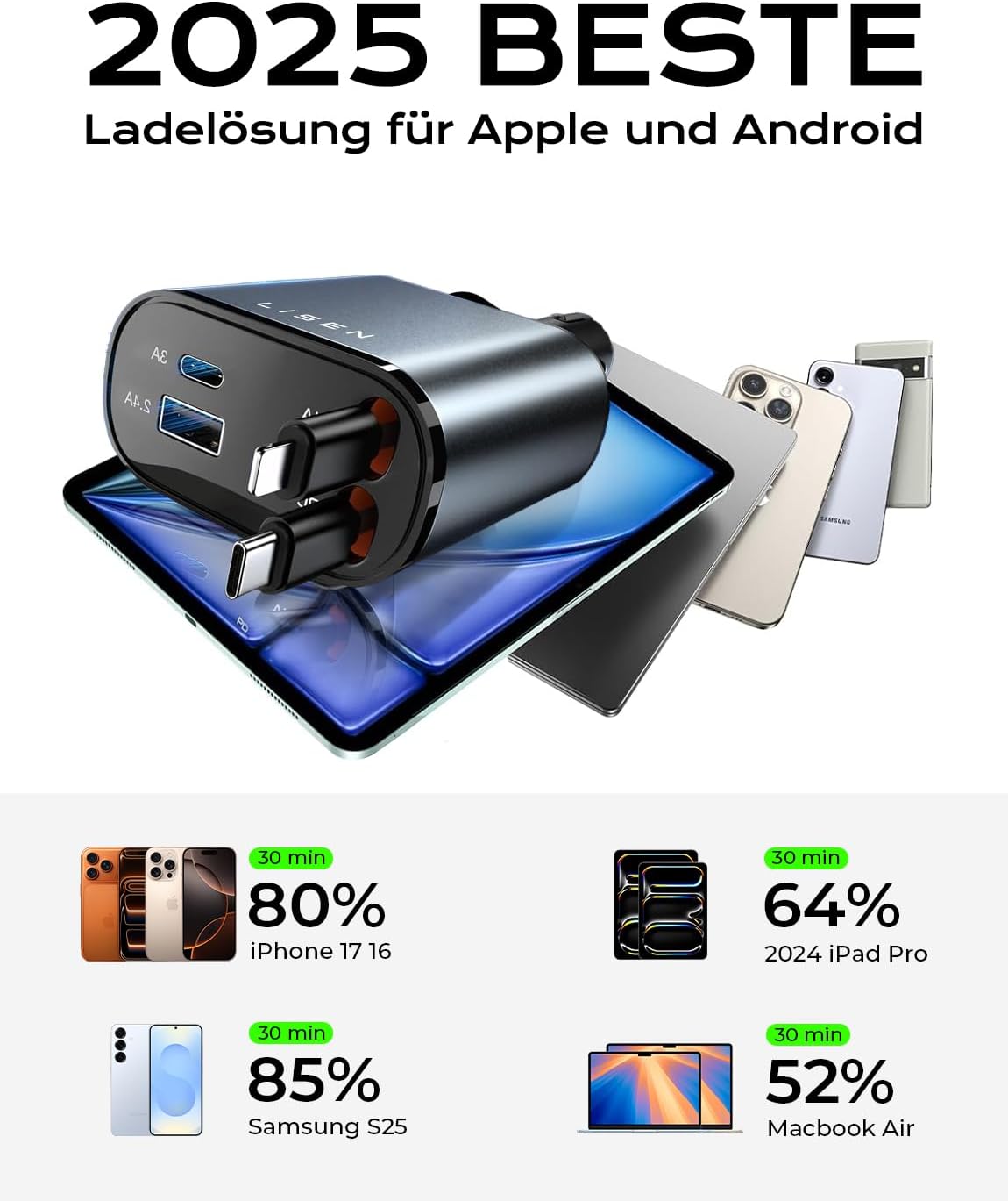 • Зареждане на множество устройства за всички пътници: независимо дали са отпред или отзад. Зарядното за кола LISEN 4 в 1 с 2 USB порта (USB-A 12W + USB-C 15W), 30W USB-C и 12W прибиращ се кабел за iPhone (до 80 см) зарежда до четири устройства едновременно. Идеално за семейни излети или споделено пътуване - без заплетени кабели, само пълна мощност.