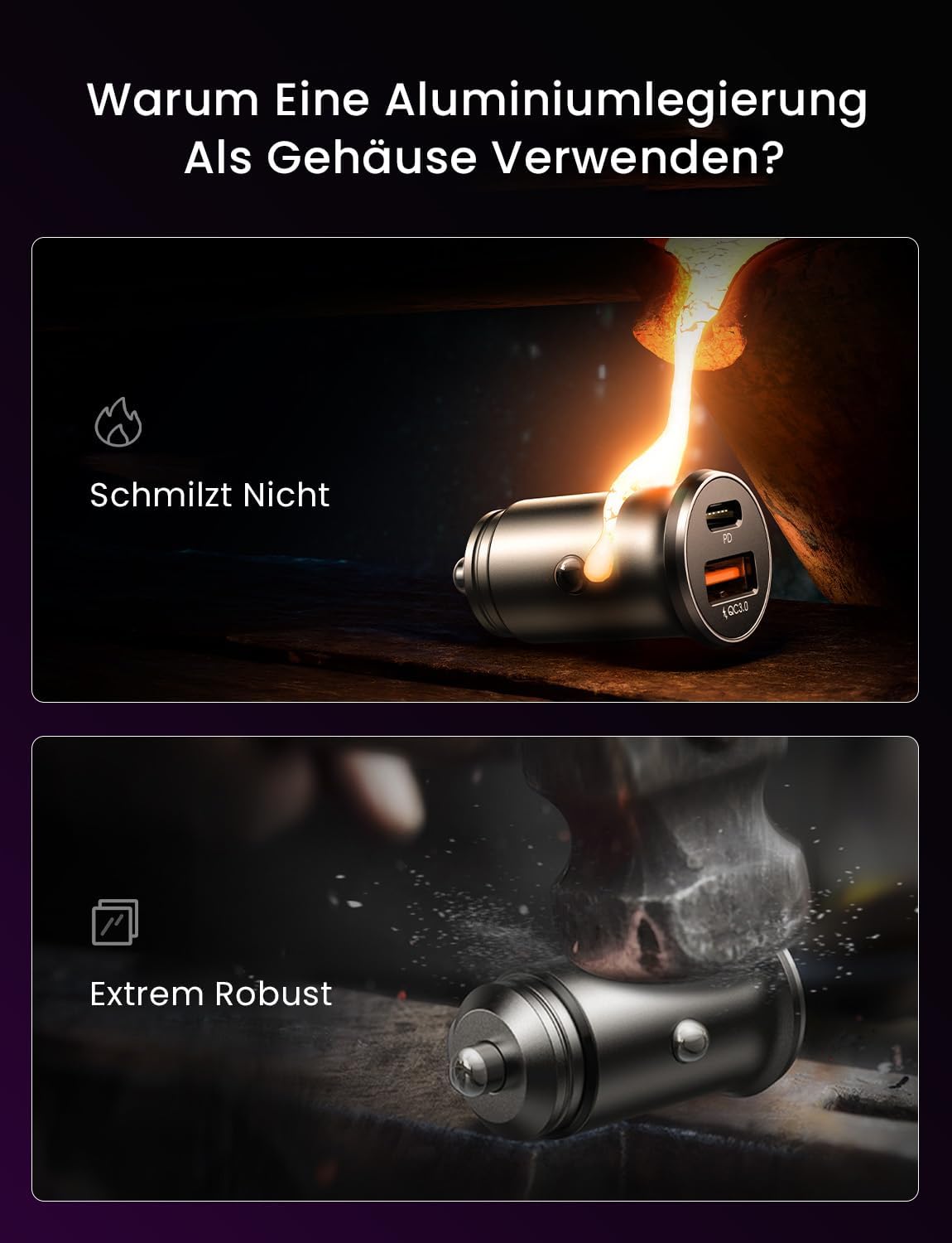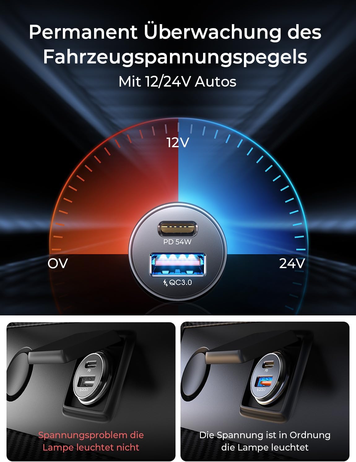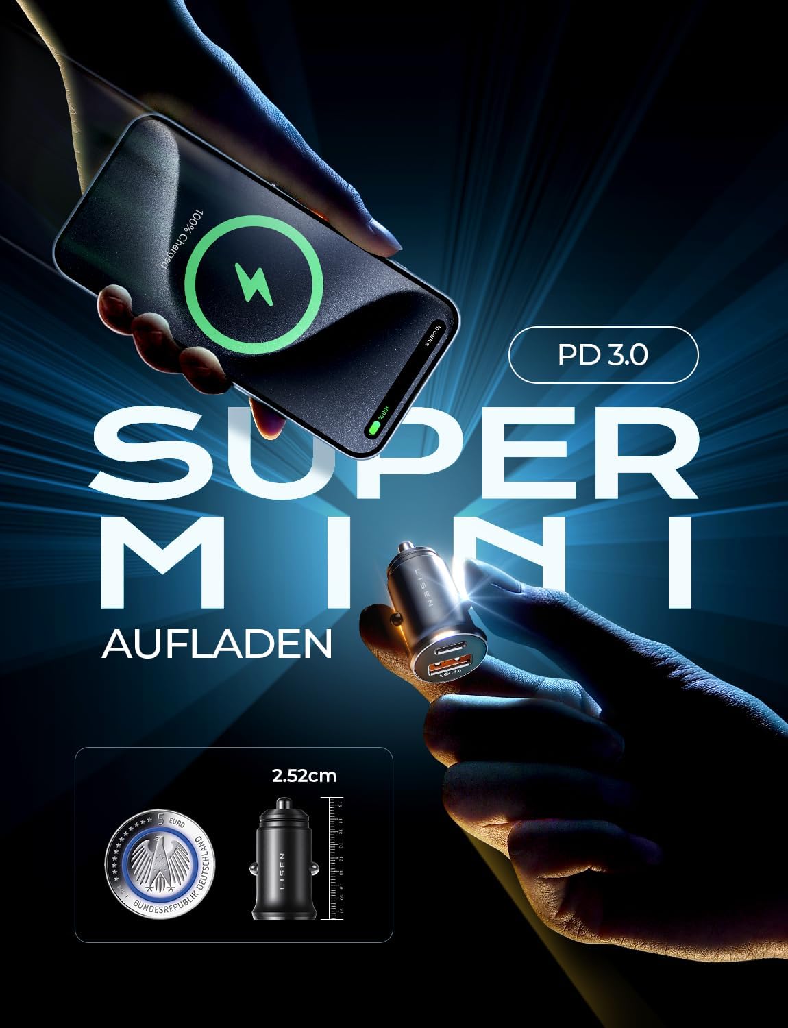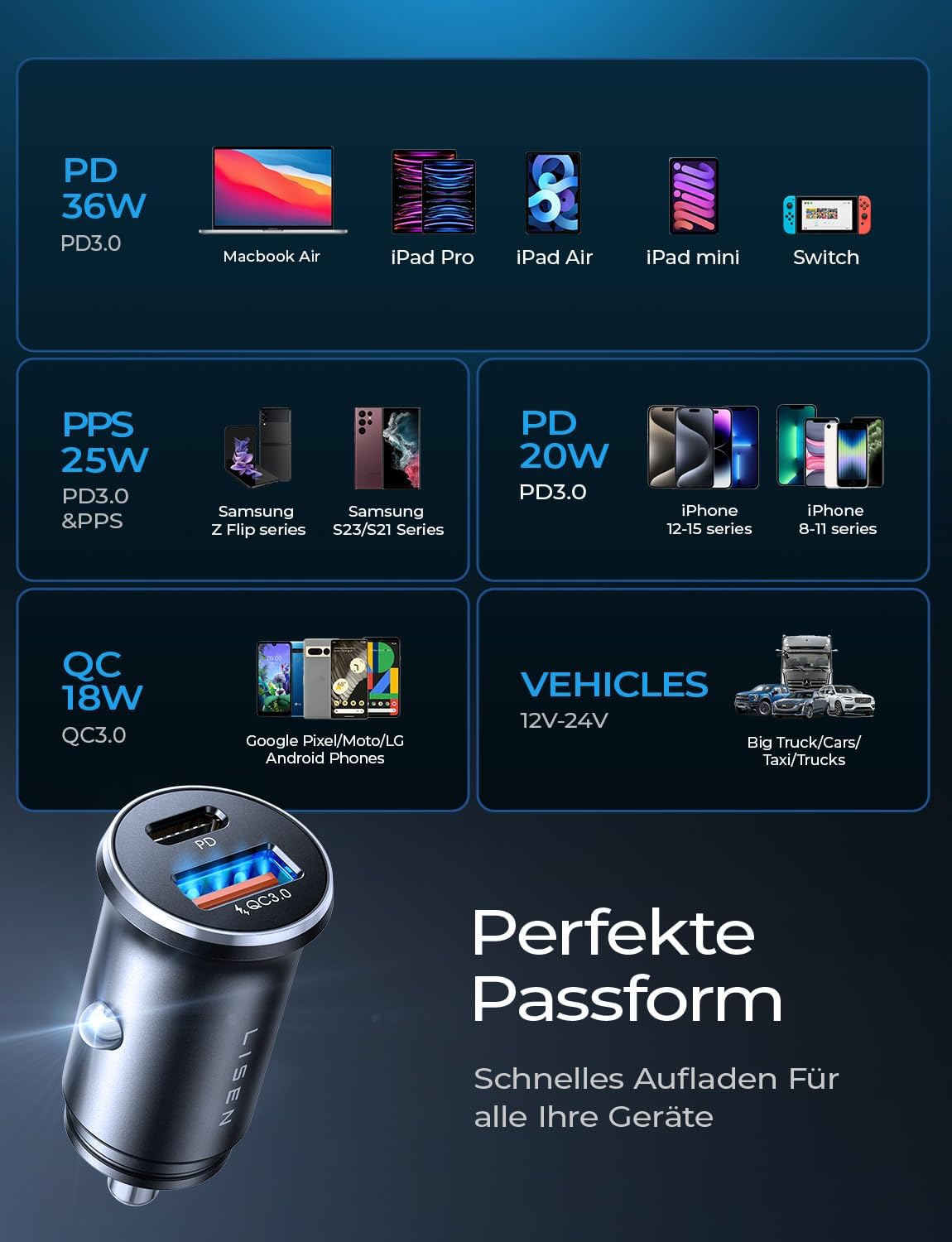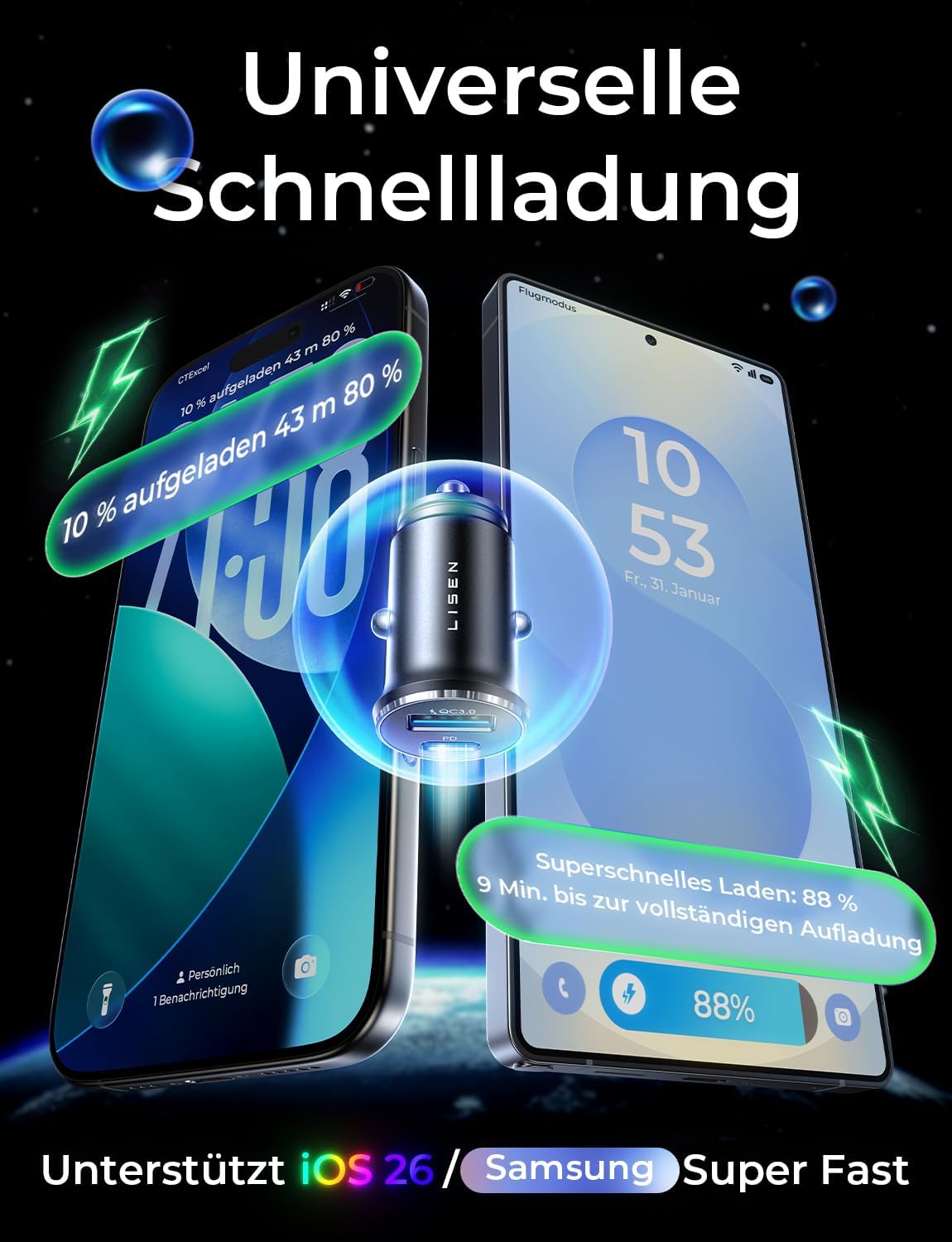 • Супер бързо зареждане с 36 W PD: USB C порт за запалка LISEN. Супер бързият 12 V порт за запалка с чисто новото подобрение PD36W може да зареди iPhone серията 16/15/14/13/12 до 80% и iPad до 60% за 30 минути. USB C портът за запалка и двойните портове на този USB C порт за запалка се зареждат едновременно и независимо, без да се намалява скоростта на зареждане.