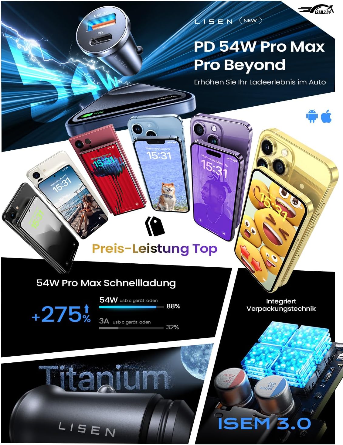 • Двоен PD3.0 + QC3.0: Двойното зарядно за кола LISEN с разпределител за запалка включва USB-C и USB-A порт, който има два порта PD 3.0 (36W) и QC 3.0 (18W) за оптимизиране на скоростта на зареждане. USB адаптерът за запалка увеличава максимално скоростта на зареждане на вашето устройство. Разпределителят за запалка прави времето за зареждане на Samsung Galaxy S24 / iPhone 15 Pro Max от 0% до 88% за 30 минути.
