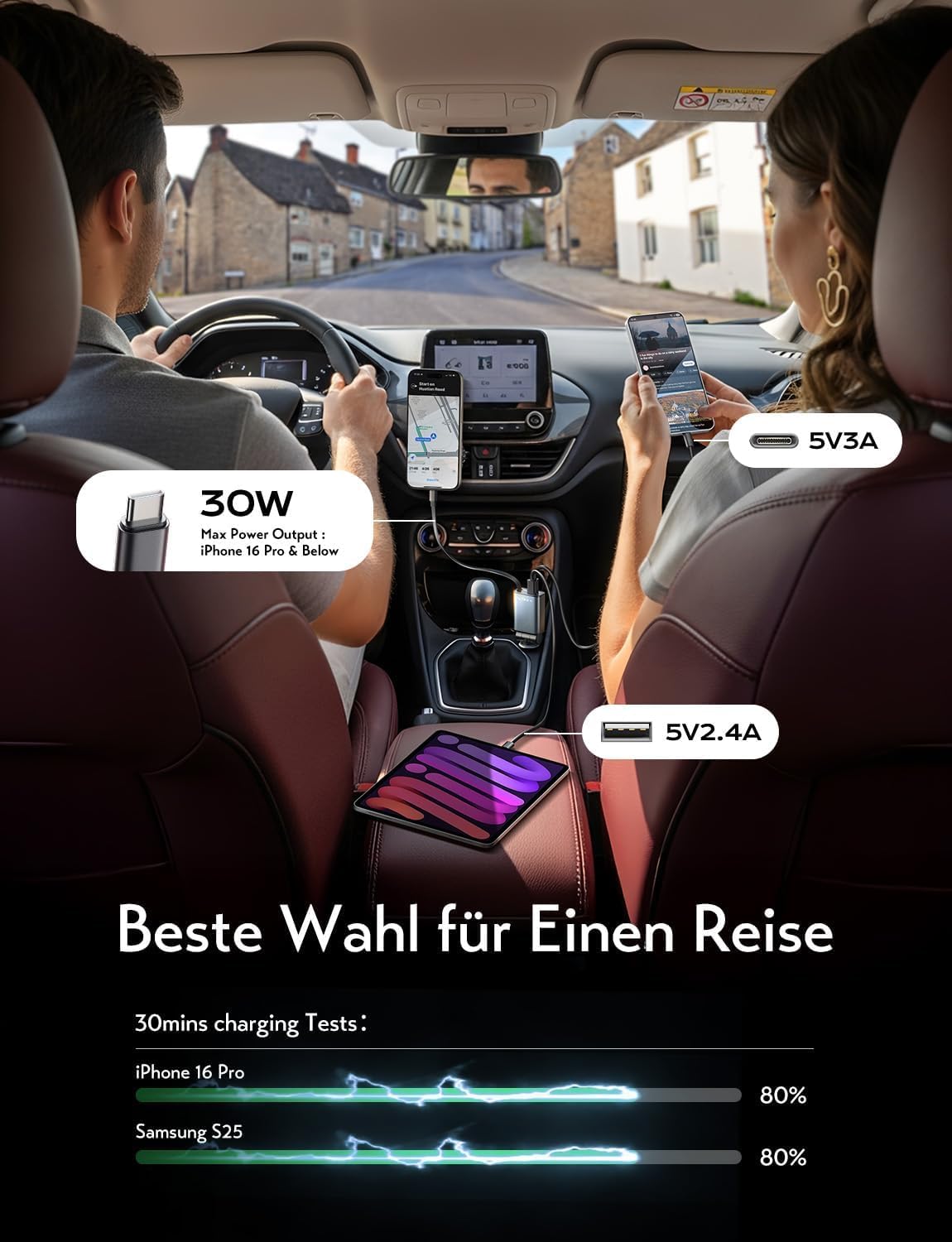 • Производителност и простота: нашето зарядно за кола е повече от обикновен кабел за зареждане. USB C портът за запалка осигурява пълна мощност от 30 W. В допълнение, това USB C порт за кола е вашият идеален 12 V USB адаптер за кола в движение. USB C портът за запалка зарежда вашия смартфон с до 30 W в турбо режим. Перфектен е като кабел за зареждане за iPhone, Xiaomi, Samsung и др. Два допълнителни порта го правят идеалното зарядно за цялото семейство.