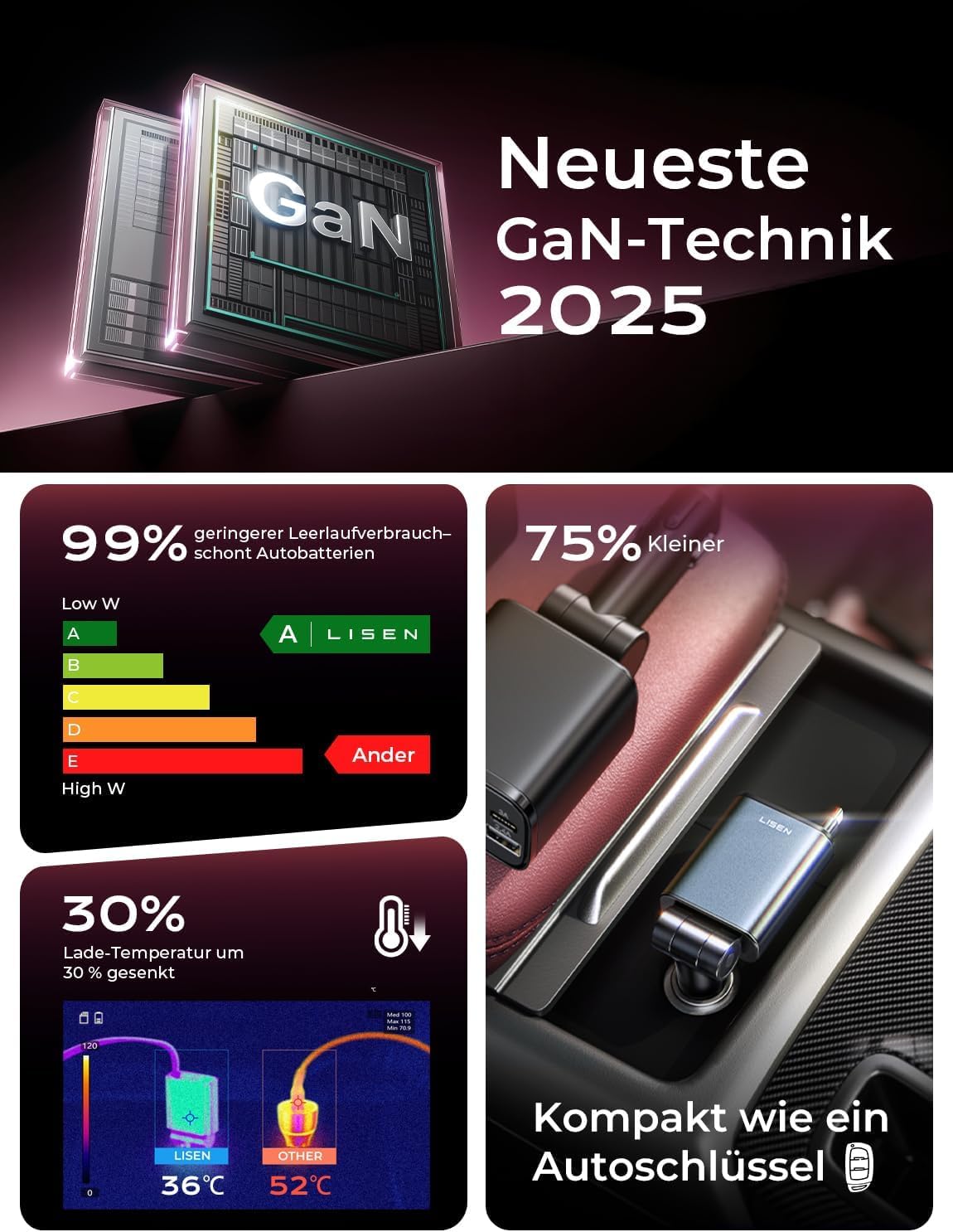 • Ултра компактно и универсално: това зарядно за кола е нашето най-компактно зарядно за кола с USB C. Умният 12 V USB адаптер за кола спестява над 75% място в USB порта на запалката. Идеално е като компактно зарядно за кола за всяко превозно средство.