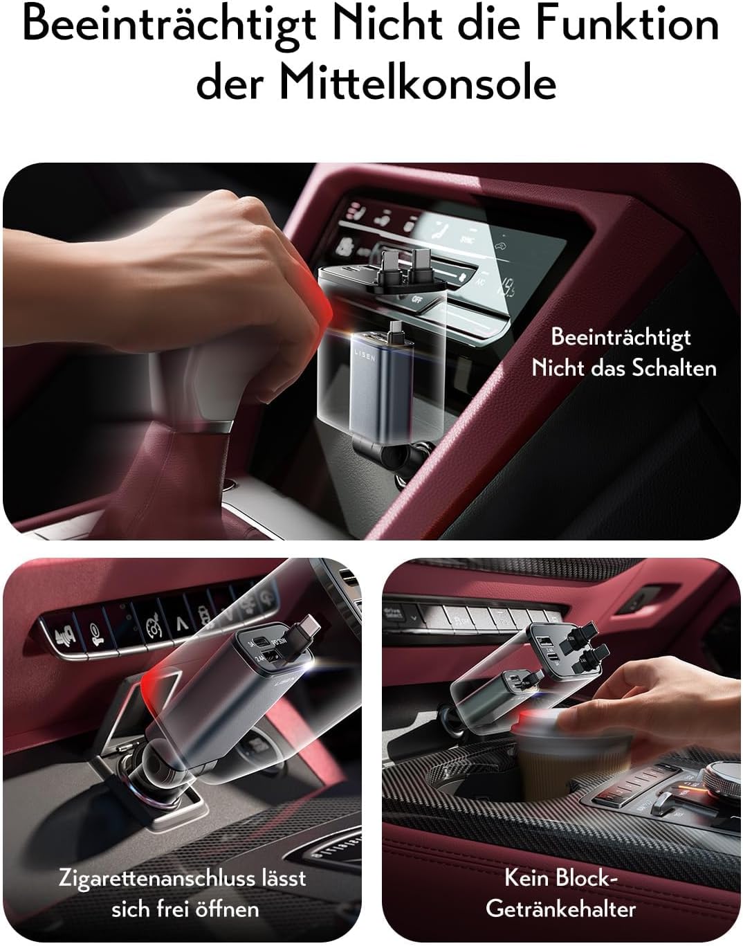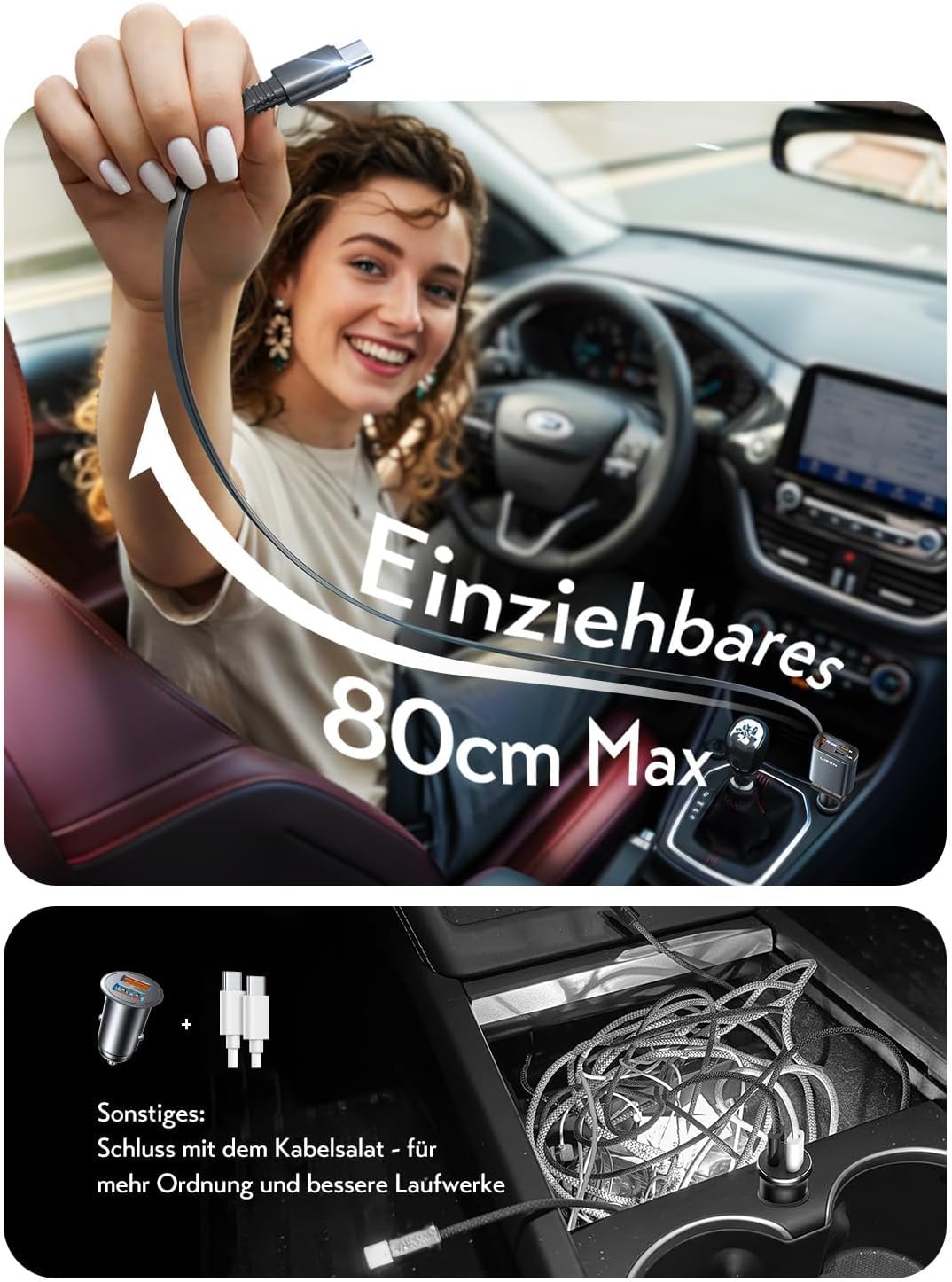 • Гъвкавост и комфорт: интегрираният кабел за зареждане е гениално решение. Разтяга се от 0 до 75 см и се връща автоматично назад. Край на хаоса с кабелите за потребителите на зарядни за кола. Просто издърпайте и освободете - този кабел за зареждане се управлява сам и винаги остава подреден. Интегрираният кабел за зареждане прави това зарядно устройство уникално. Като универсално зарядно устройство за кола, то замества конвенционалните решения.