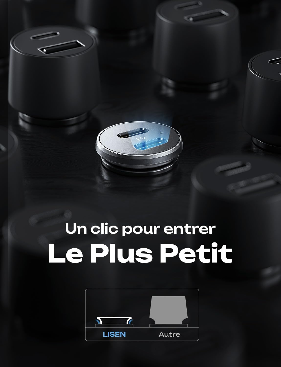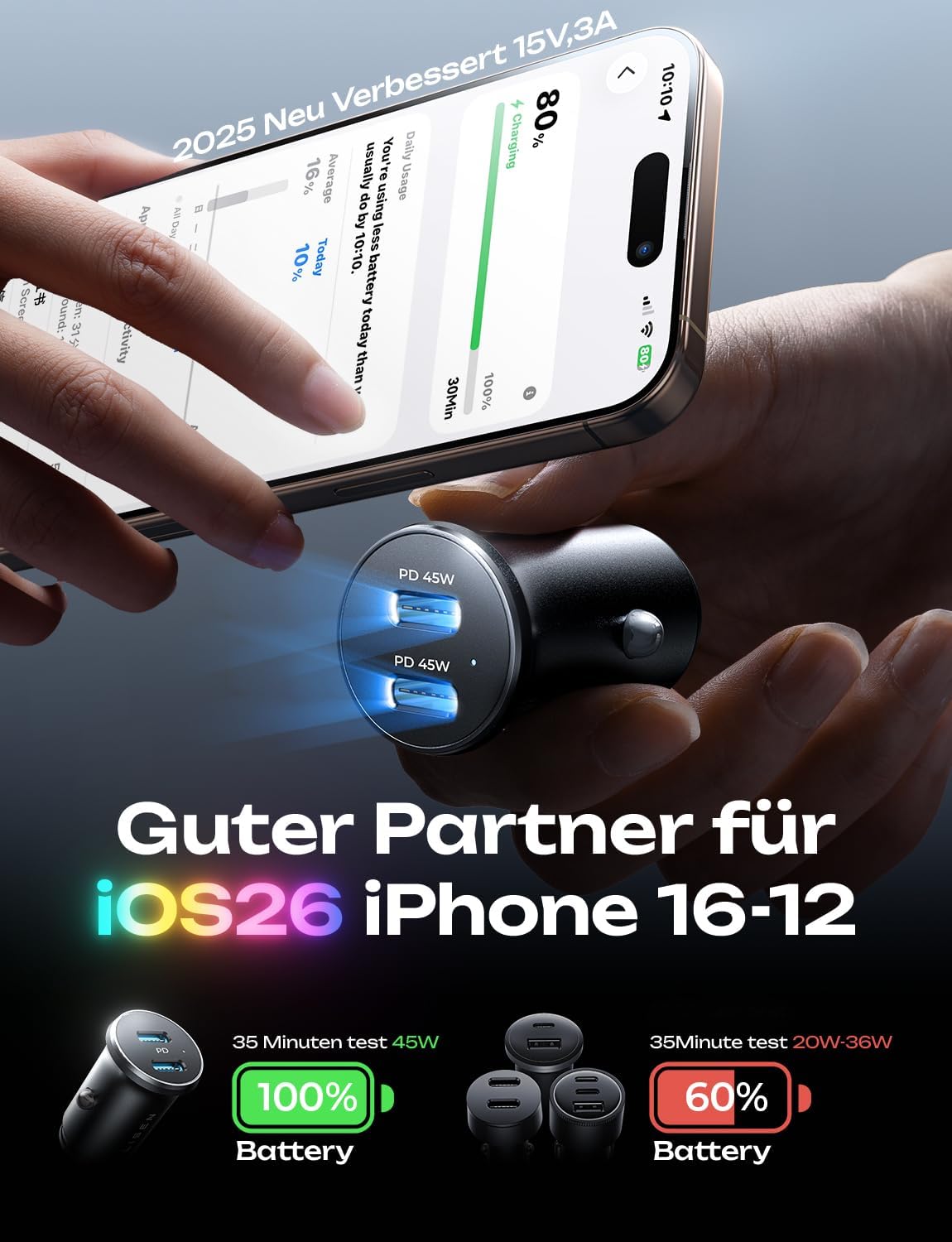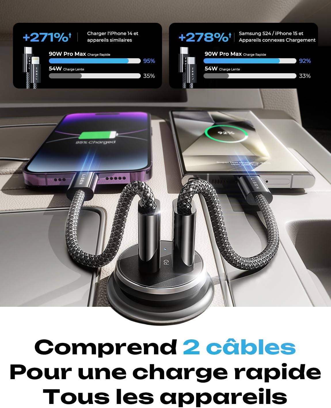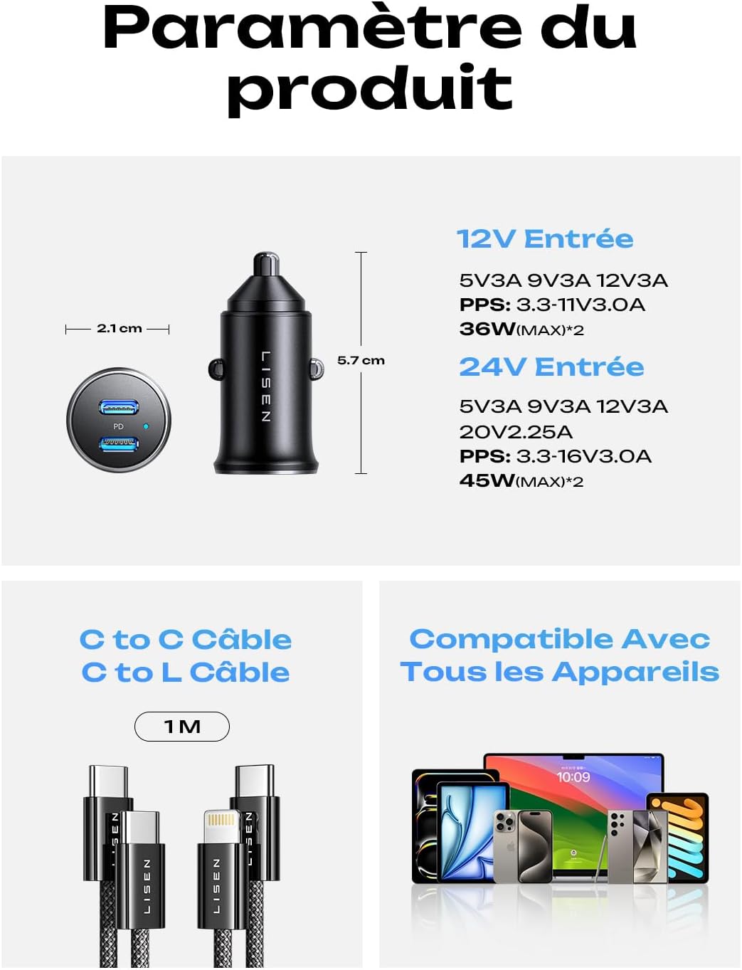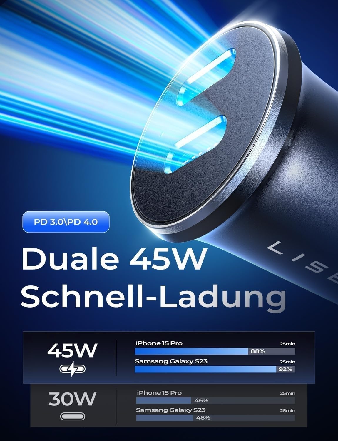 • Двоен 90W порт за бързо зареждане: LISEN USB C портът за запалка за iPhone 15 Pro е оборудван с два PD3.0 порта за бързо зареждане, така че максималната обща мощност е до 90W. Поддържа едновременно PD 45W бързо зареждане на всяко мобилно устройство. 10 пъти по-бърз от 30 W USB порт за запалка за автомобил, Samsung Galaxy S23 може да се зареди бързо от 0% до 80% за 30 минути.