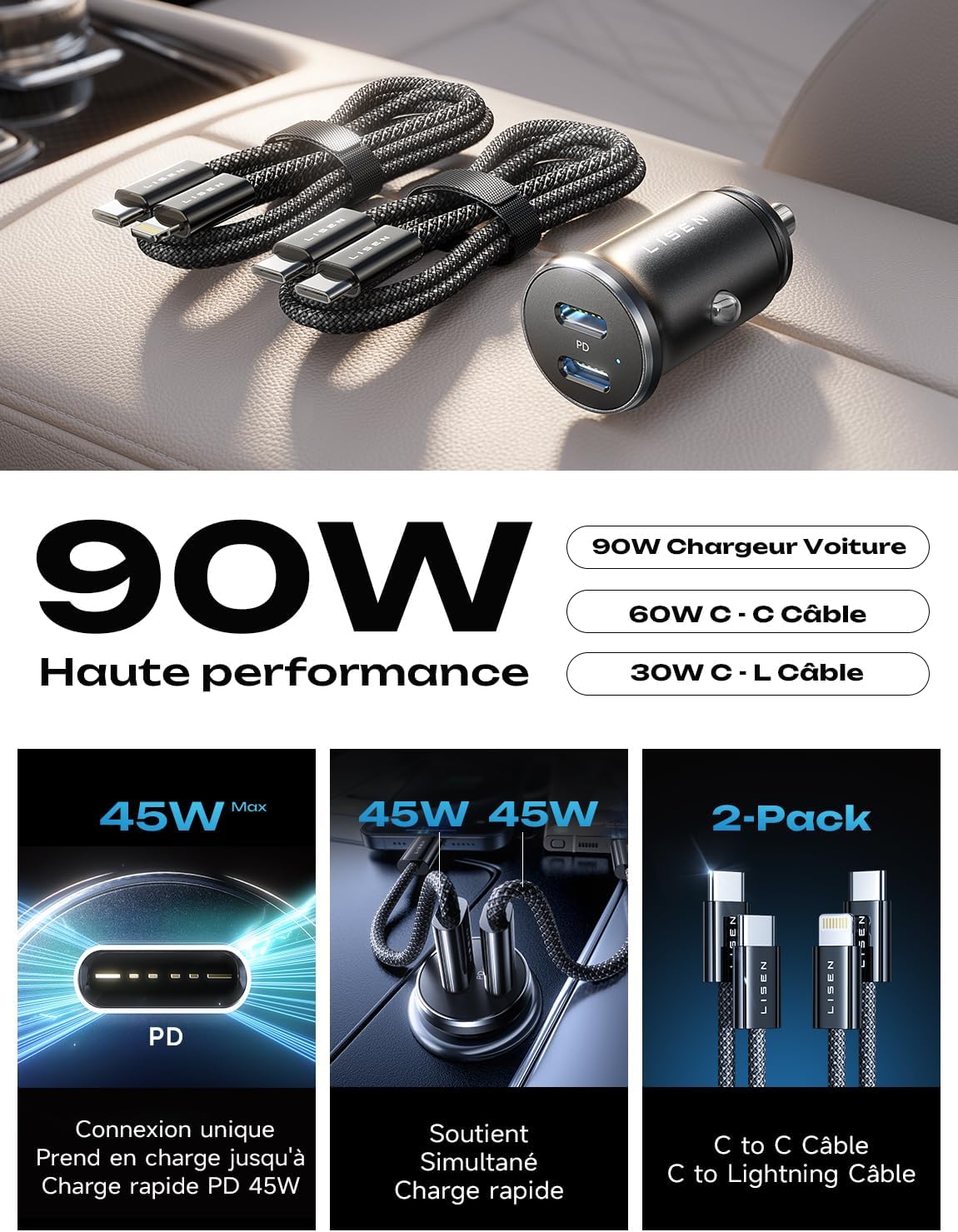 LISEN 90 W USB C разклонител за запалка [12 V гнездо с два PD45W] Мини изцяло метално зарядно за кола USB C с USB C кабел и Lightning кабел за iPhone 14/15 Pro Max, Google Pixel, Samsung, Huawei