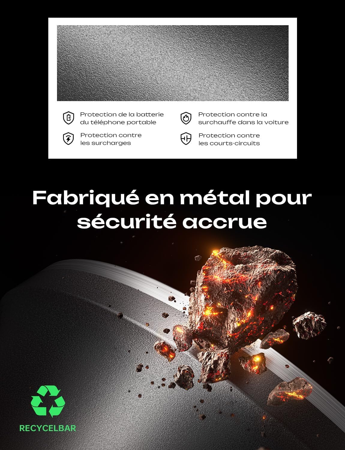• Изцяло метален, не се нагрява: изцяло алуминиевият корпус е устойчив на надраскване, издръжлив и атрактивен. Висококачественият материал гарантира, че зарядното ви за кола винаги ще изглежда като ново. Този USB адаптер за запалка, изработен от метал, не прегрява при високи температури и следователно е по-безопасен от пластмасовите.