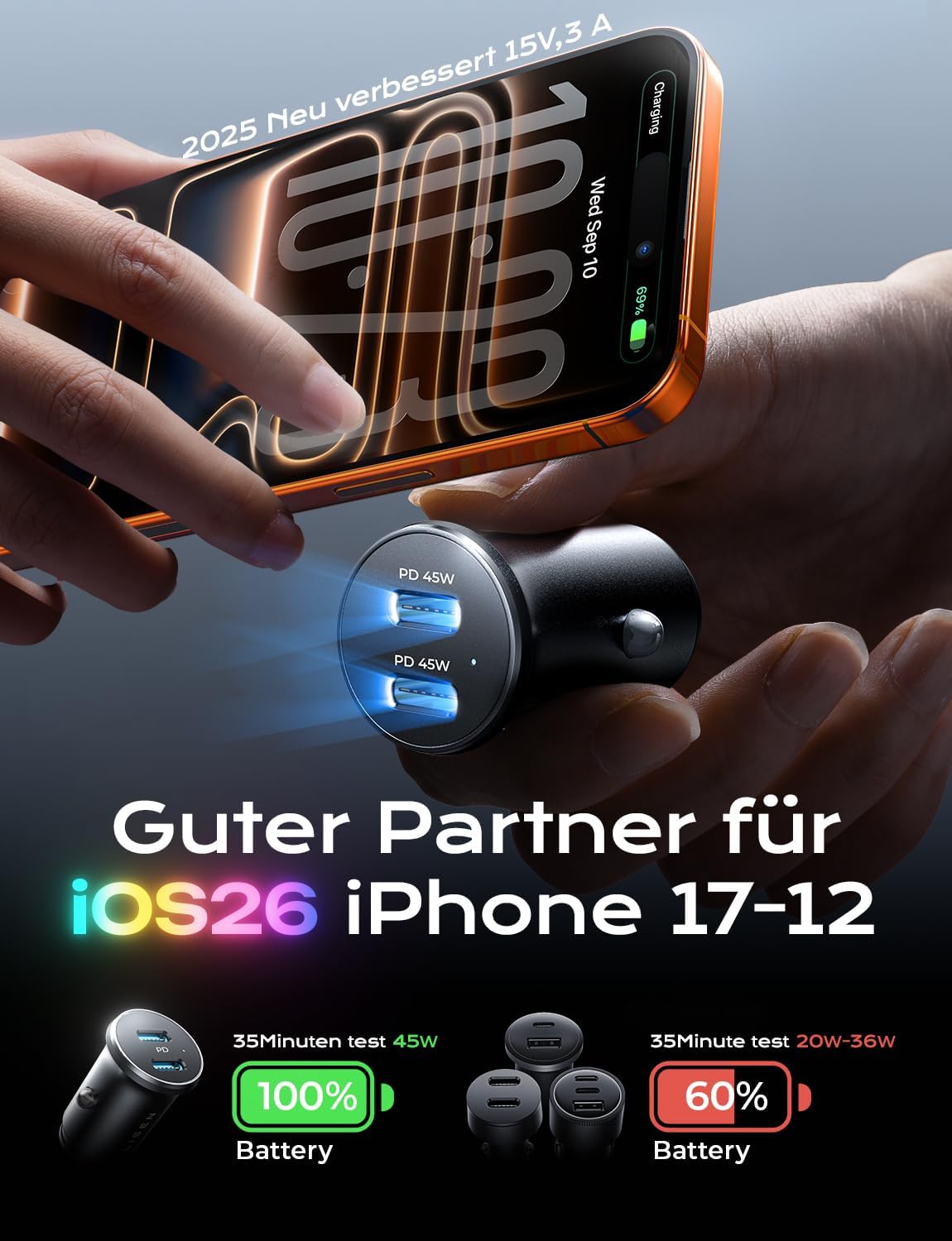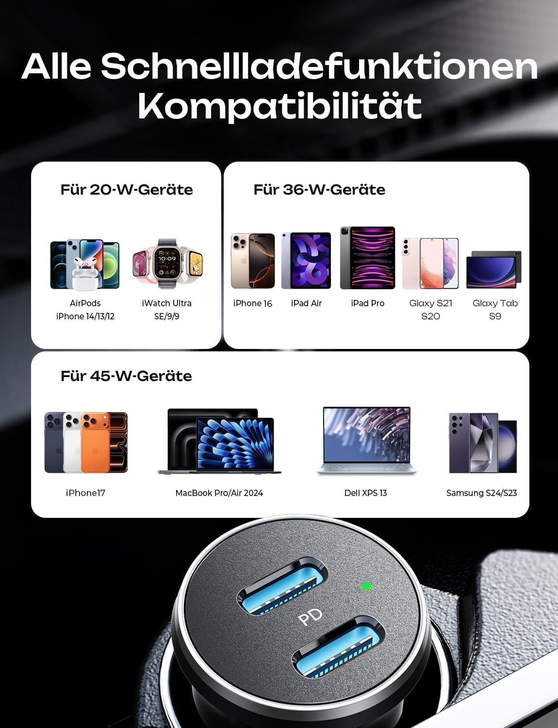 • Двоен порт за бързо зареждане 90 W: за разлика от конвенционалните зарядни за кола A+C, запалката LISEN USB C е оборудвана с два порта за бързо зареждане PD3.0, така че максималната мощност е общо до 90 W. Поддържа бързо зареждане PD 45W за всяко мобилно устройство едновременно. Това е особено полезно за потребители, които искат бързо да зареждат две високопроизводителни устройства едновременно, като например iPhone 16 Pro Max и iPad Pro.