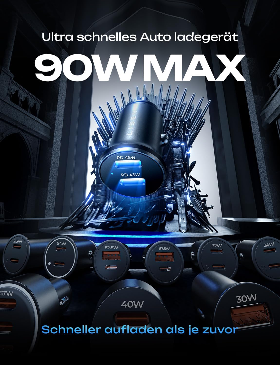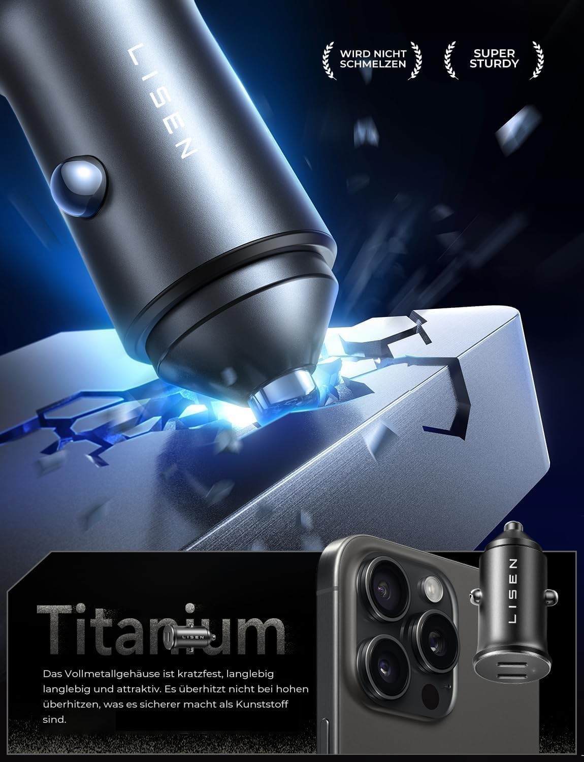 LISEN 90 W за iOS 26 Супер бързо зареждане за запалка USB C, [Мини титаниев 12 V адаптер за контакт] Зарядно за кола USB C, Зарядно за кола с бързо зареждане за iPhone 16 15 Pro Max iPad Galaxy S25 S24
