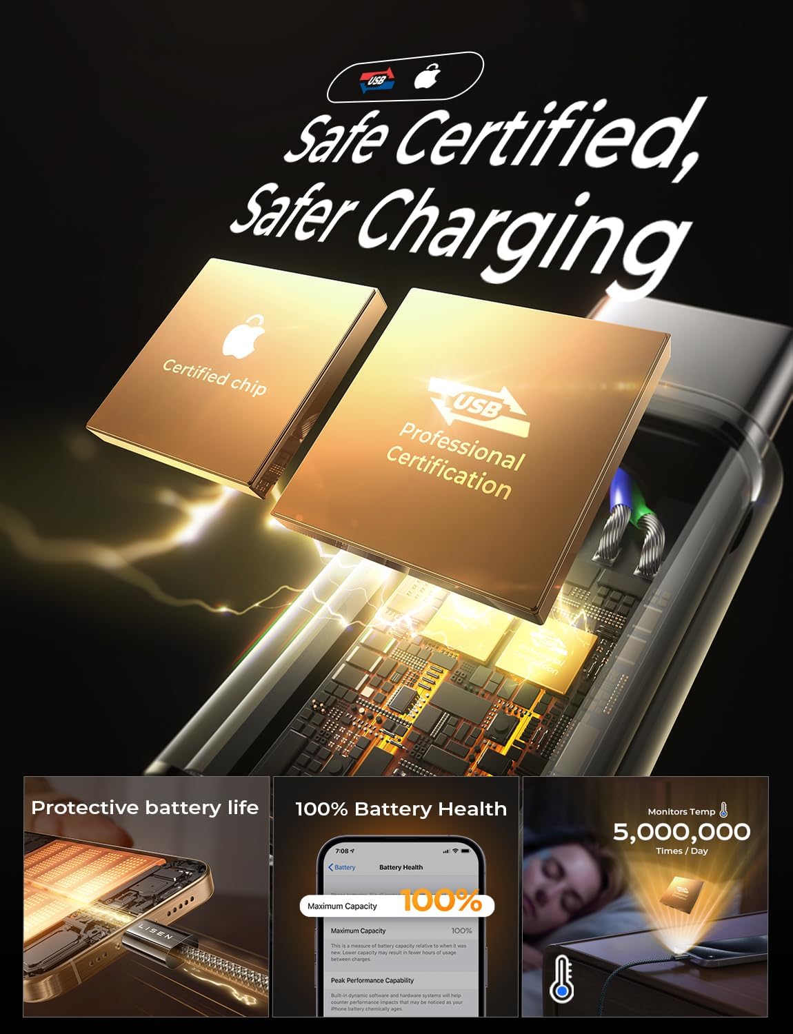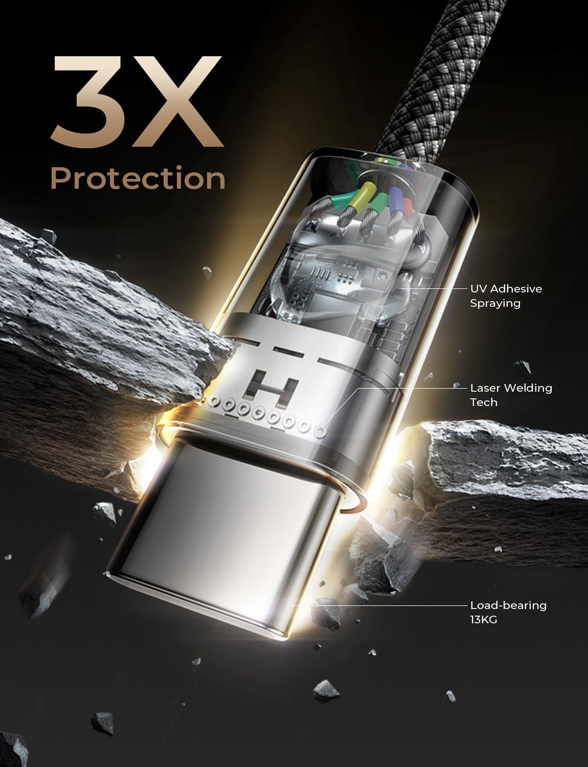 • USB-C порт с тройна защита: кабелът за бързо зареждане USB C има сертификати за електронна безопасност, които отговарят на съответните стандарти. Изработен е с технология за лазерно заваряване, която гарантира, че металната част не се счупва. Медната сърцевина е подсилена с UV лепило, за да се предотврати падането на спойките. USB-C портът преминава тест за натоварване от 13 кг, което обещава по-дълъг експлоатационен живот и никога няма да се счупи.