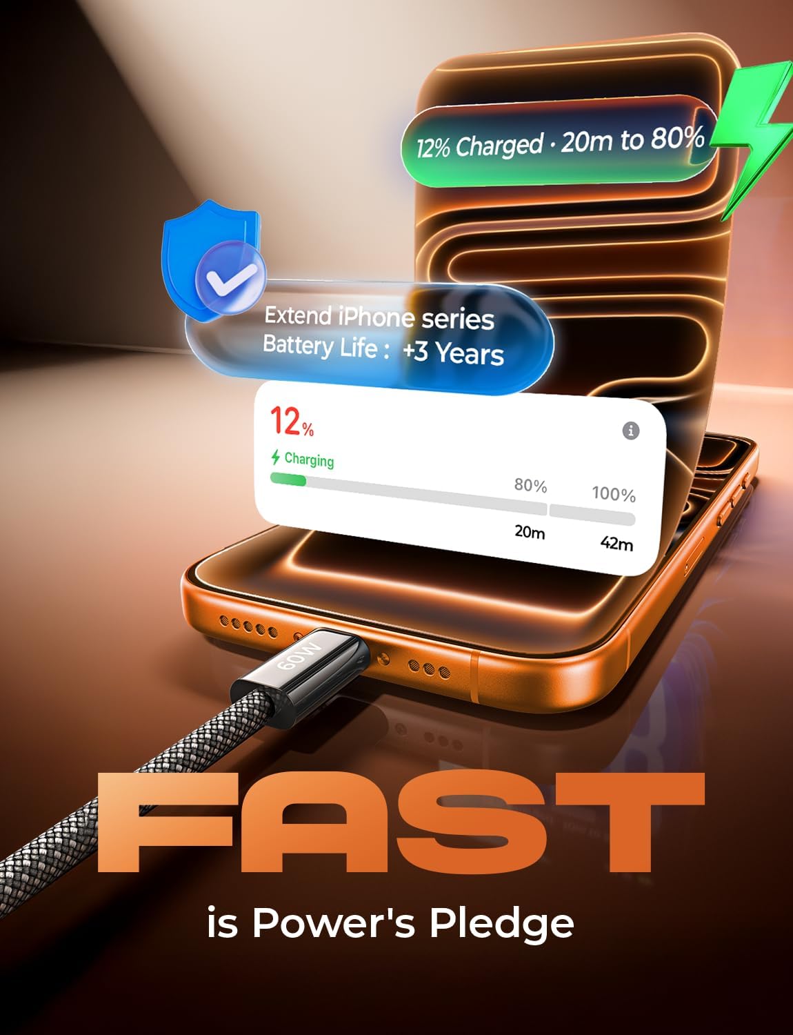 • 60 W кабел за светкавично бързо зареждане USB C: Този комплект USB към USB C кабели поддържа бързо зареждане PD3.0/QC3.0/QC4.0 до 60 W макс. (20 V/3 A) с USB-C адаптери за захранване, като например 30 W/45 W/60 W. Той е 2,2 пъти по-бърз от 3,1A версията и зарежда USB C телефони iPhone 17 Pro за 35 минути от 0% до 80%, iPad Pro до 64% ​​за 35 минути, MacBook Air до 50% за 35 минути и предлага скорости на пренос на данни до 480 Mbps (синхронизация от 1200 песни в минута).