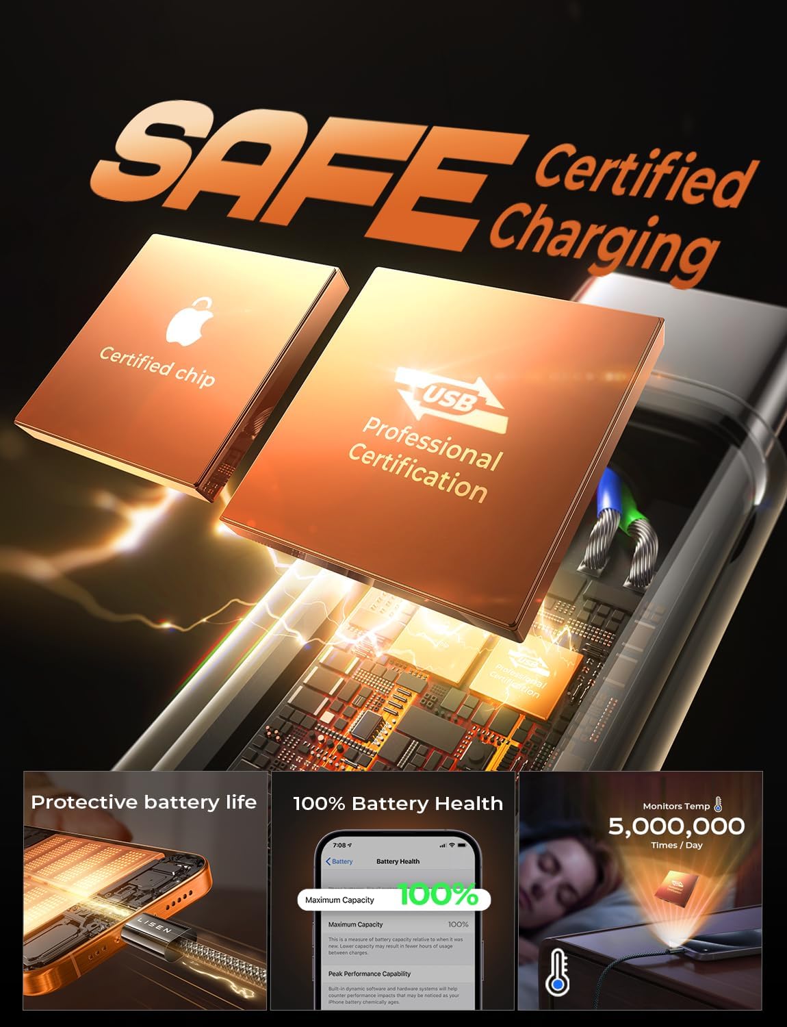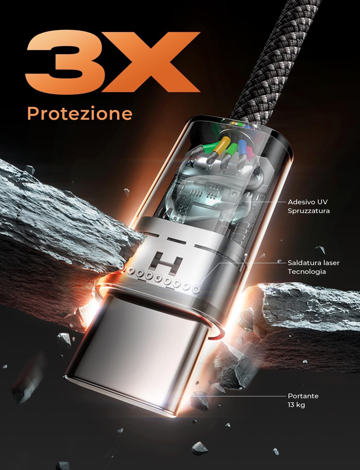• USB-C порт с тройна защита: кабелът за бързо зареждане USB C има сертификати за електронна безопасност, които отговарят на съответните стандарти. Изработен е с технология за лазерно заваряване, която гарантира, че металната част не се счупва. Медната сърцевина е подсилена с UV лепило, за да се предотврати падането на спойките. USB-C портът преминава тест за натоварване от 13 кг, което обещава по-дълъг експлоатационен живот и никога няма да се счупи.