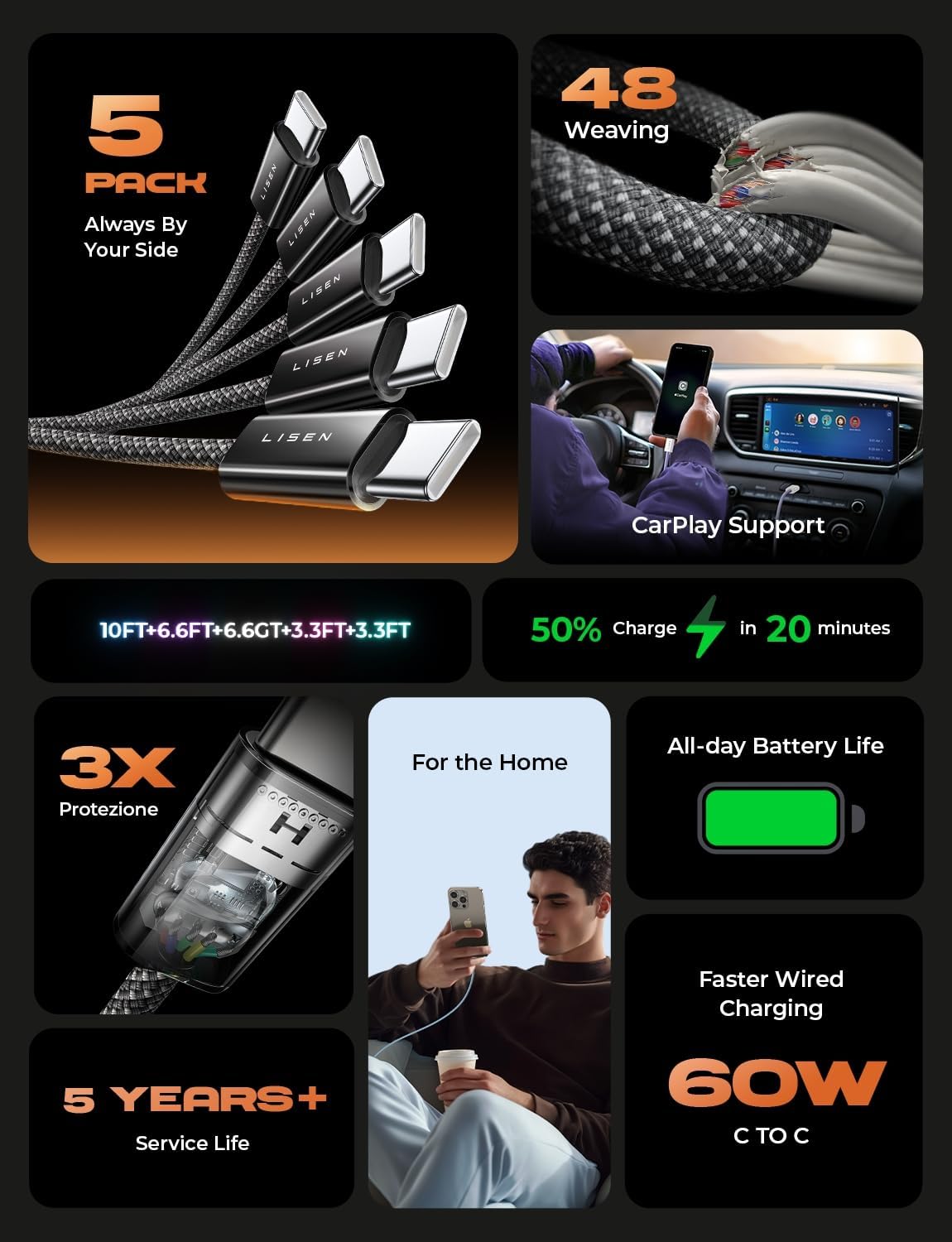 LISEN USB C кабел, пакет от 5 (1/1/2/2/3 м) USB C към USB-C кабел за iPhone 16e 15 Pro Max кабел за зареждане, 60W (3.1A) C към C кабел, бързо зареждане за Samsung S25/S24/23, Switch 2, iPad, MacBook