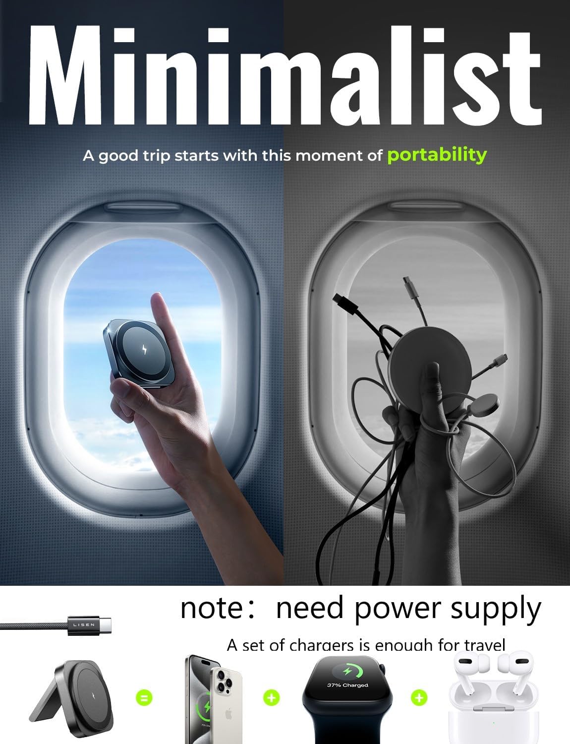 LISEN За зарядна станция Apple Watch и iPhone, Magsafe зарядно за iPhone 17 Pro Air 16 Pro Max/15/14/13/12 аксесоари [Супер преносимо] Безжично зарядно 2025 Индуктивна зарядна станция за iPhone
