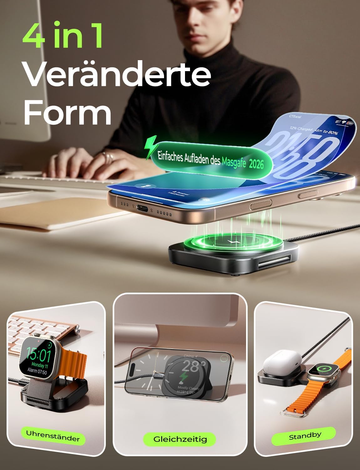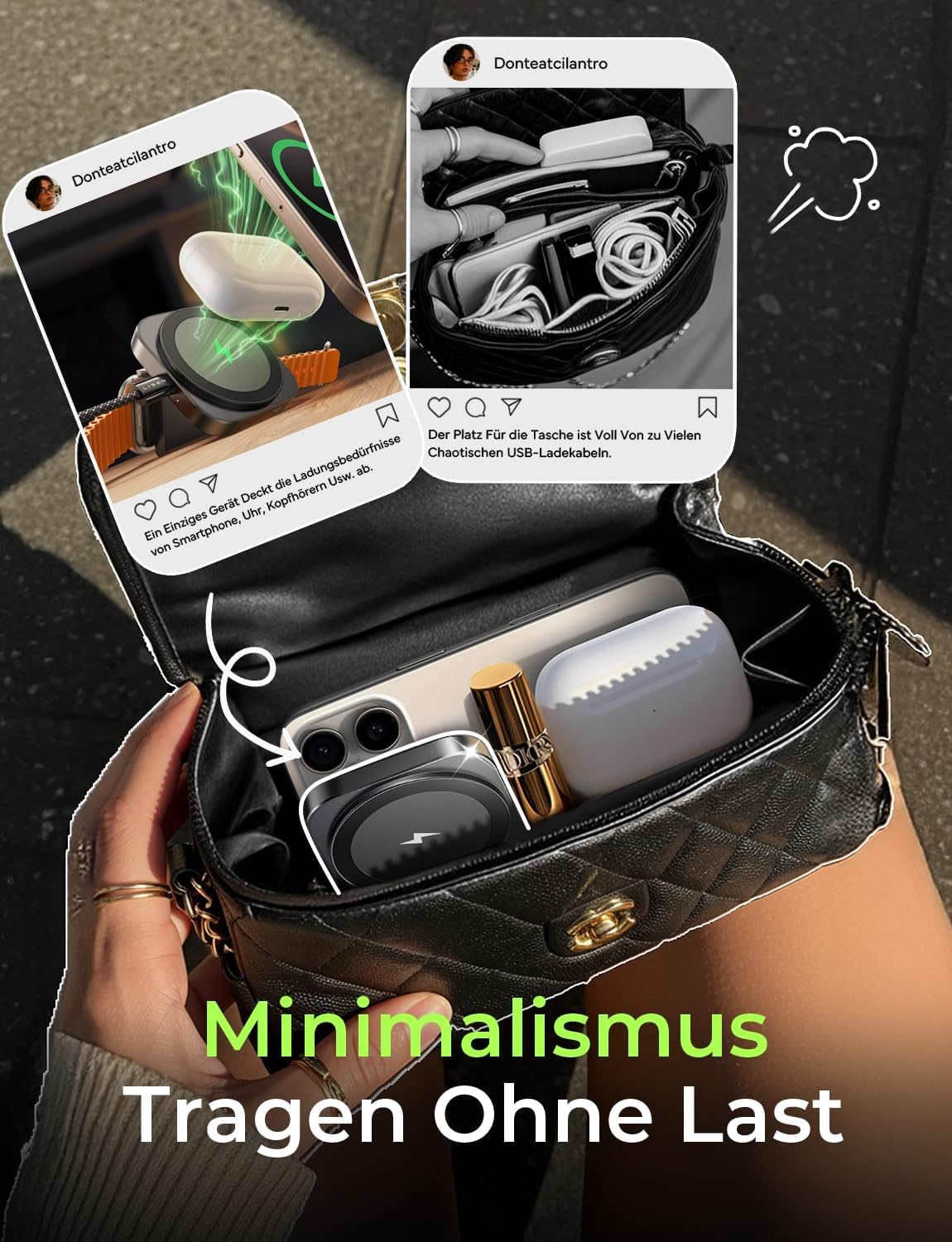 • [2025 Нова итерация Индуктивна зарядна станция Apple] Тази зарядна станция Magsafe съчетава предимствата на всички съществуващи решения за безжично зареждане на пазара, базирани на първото поколение зарядно Magsafe, с добавяне на нова стойка Magsafe и поддръжка за iPhone, iWatch, AirPods за зареждане на цялото семейство Apple. Базирана на второ поколение безжично зарядно, тя е постигнала още по-голяма преносимост. За да ви предостави наистина по-перфектно решение за безжично зареждане. Така можете да се сбогувате с заплетените и разхвърляните кабели и да поддържате стаята си подредена и организирана.
