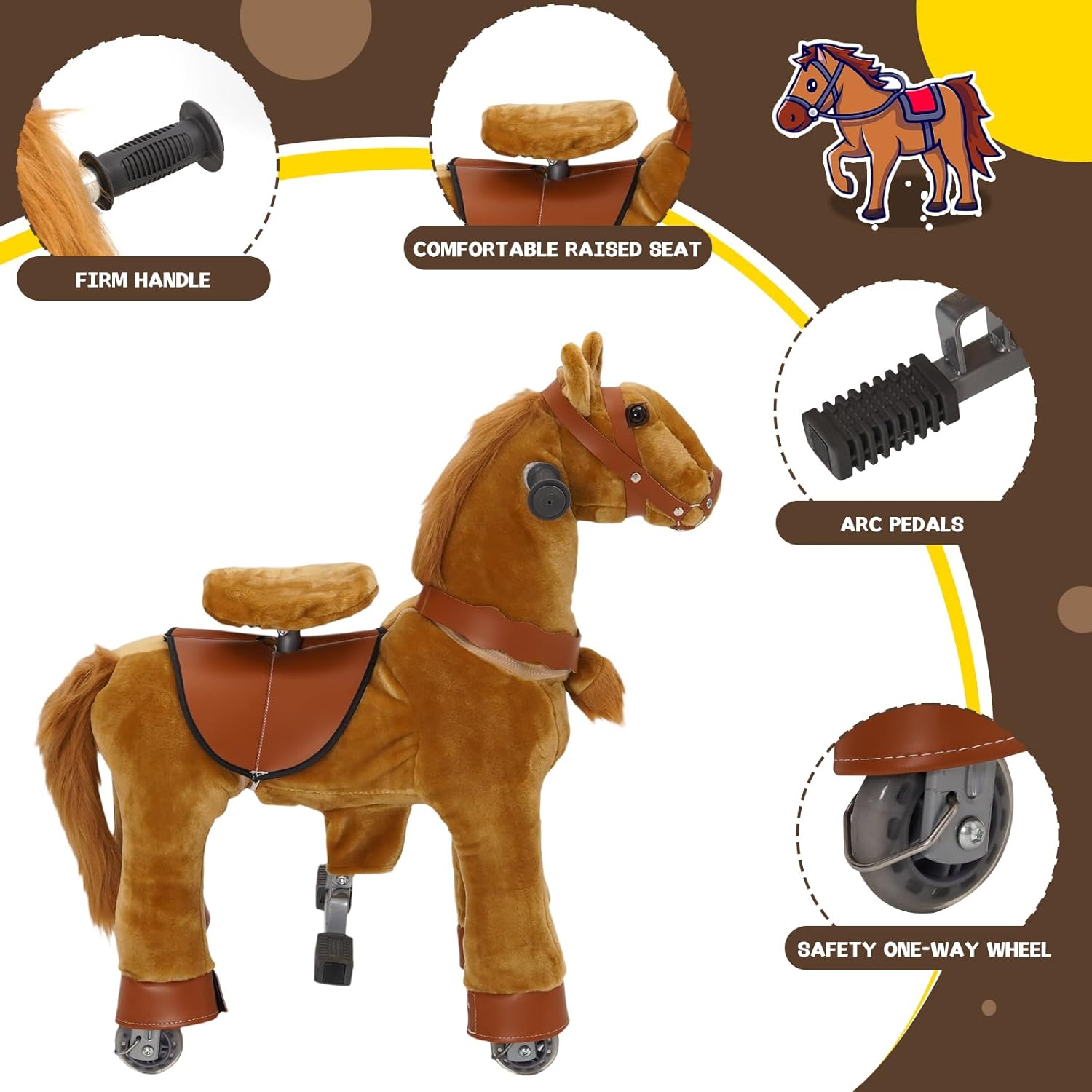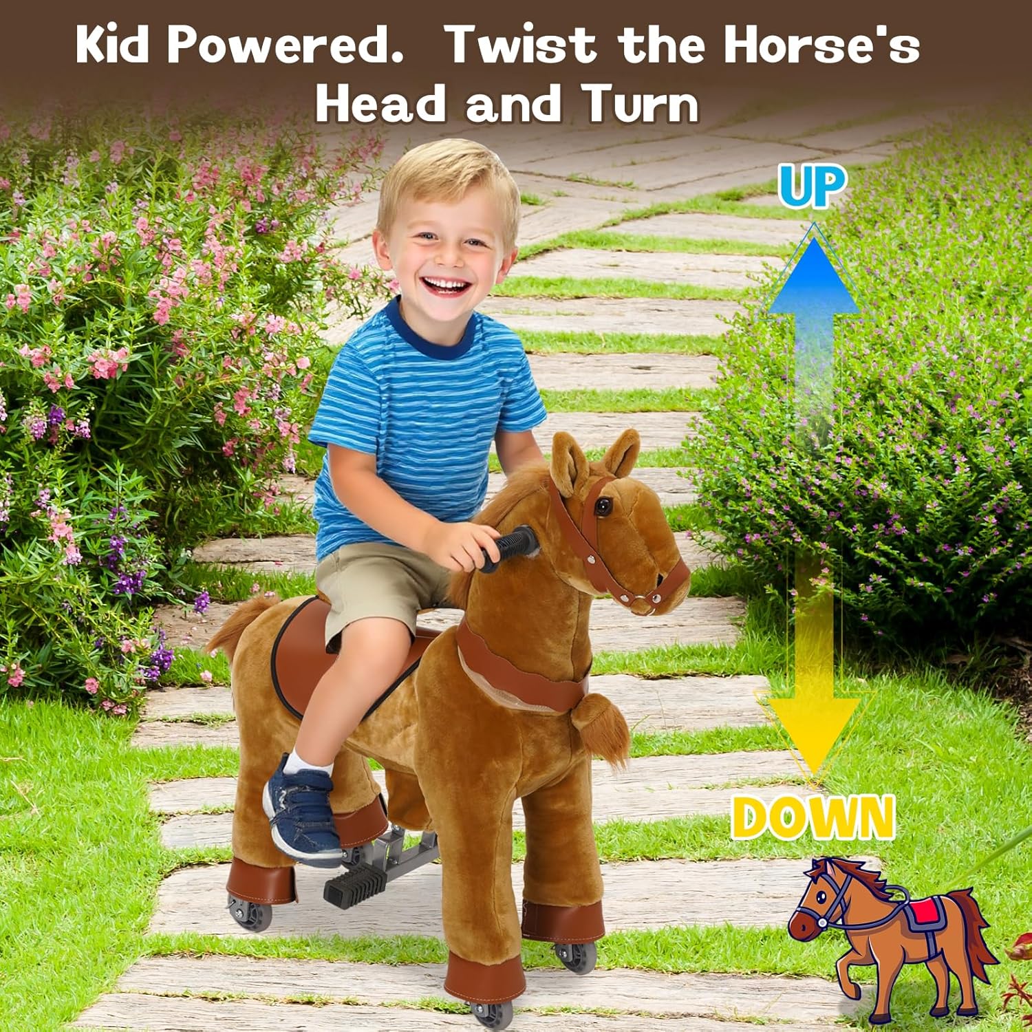 Играчката кон се задвижва от движенията на вашето дете. Детето ви може просто да стъпи върху педала, за да придвижи понито напред и да го управлява с кормилото.