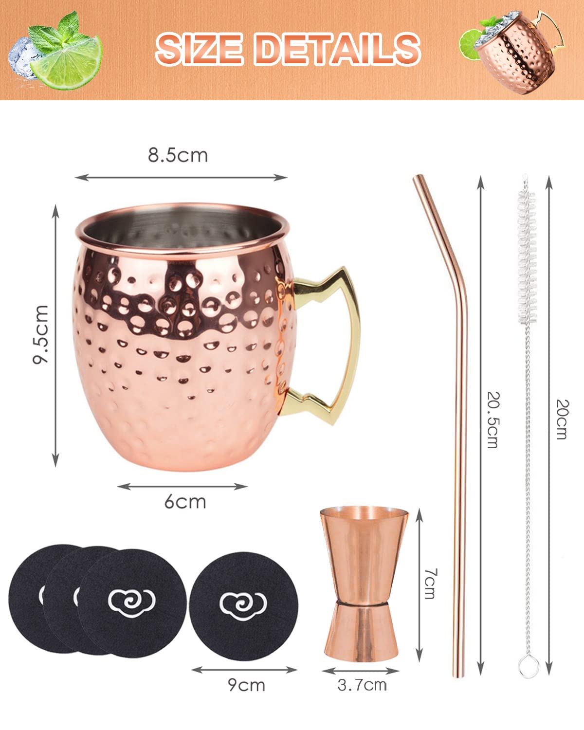 • Комплект от 4 медни чаши Moscow Mule -—Този комплект медни чаши Moscow Mule се състои от четири чаши (19,5 oz), четири подложки, четири медни сламки, джоггер и четка за сламка. Всички тези медни чаши и аксесоари Moscow Mule се предлагат в красива подаръчна кутия.