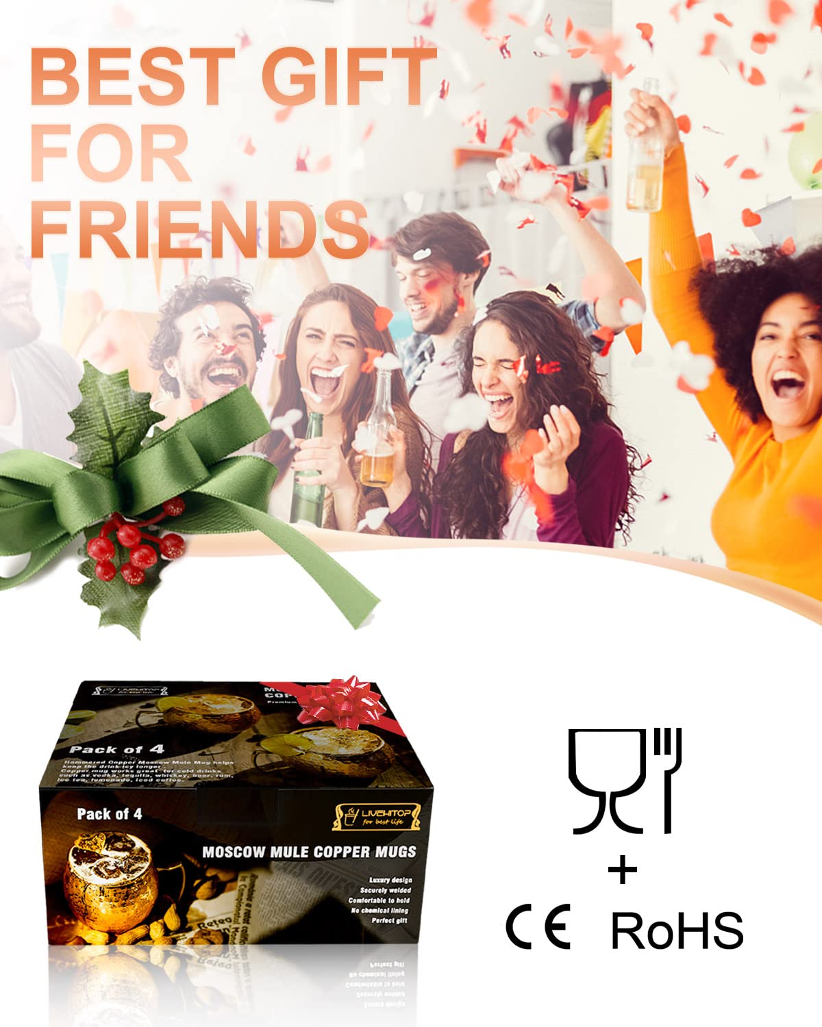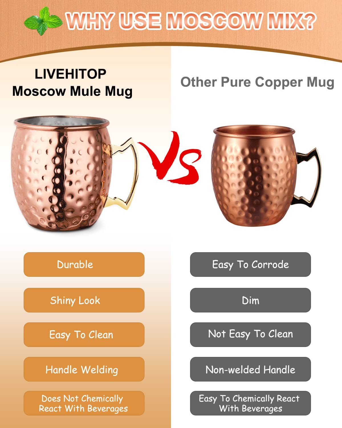 • ️Повече безопасност -— Чашата Moscow Mule от LIVEHITOP е изработена от неръждаема стомана, която, за разлика от чистата мед, е по-малко склонна да реагира с химическите компоненти в напитките и следователно е по-здравословна за човешкото тяло. Освен това, материалите от неръждаема стомана са по-издръжливи и по-лесни за почистване.