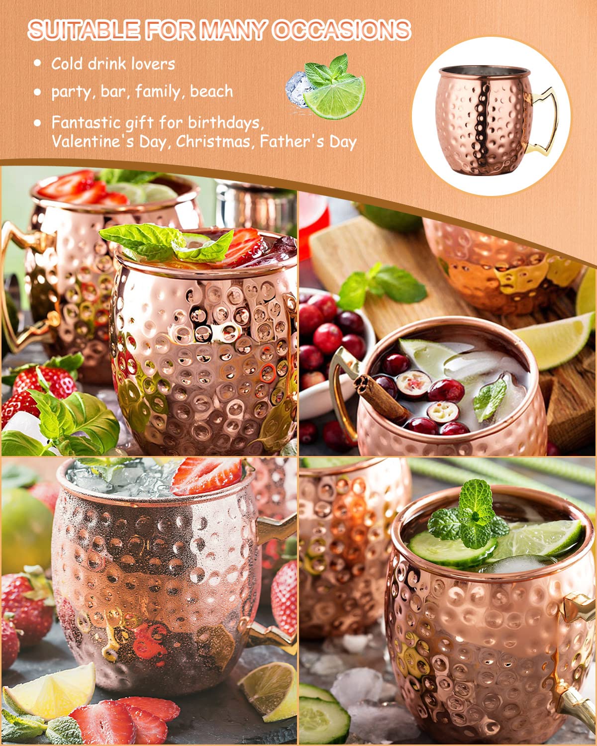 • Перфектен избор за подарък -- Чаша Mosco mule с лъскаво покритие, което е едновременно винтидж и елегантно. Тази медна чаша е отличен подарък за 7-ма годишнина от сватбата, рожден ден, Свети Валентин, Коледа, Нова година, Ден на майката и Ден на бащата. Подходяща за употреба у дома, в бар, на парти, на сватба, на тържество, през пролетта, лятото и есента, както и в други щастливи моменти.