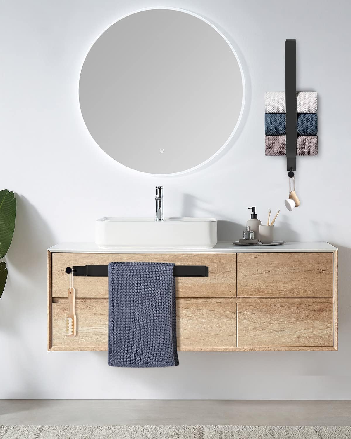 • Практичен и красив: нашият държач за кърпи за гости увеличава височината на пространството за кърпи, увеличава използваемата площ и ви позволява да поставите малко по-дебели кърпи. Черните матови куки за държач за кърпи са предназначени за окачване на малки предмети като душ топки и четки.