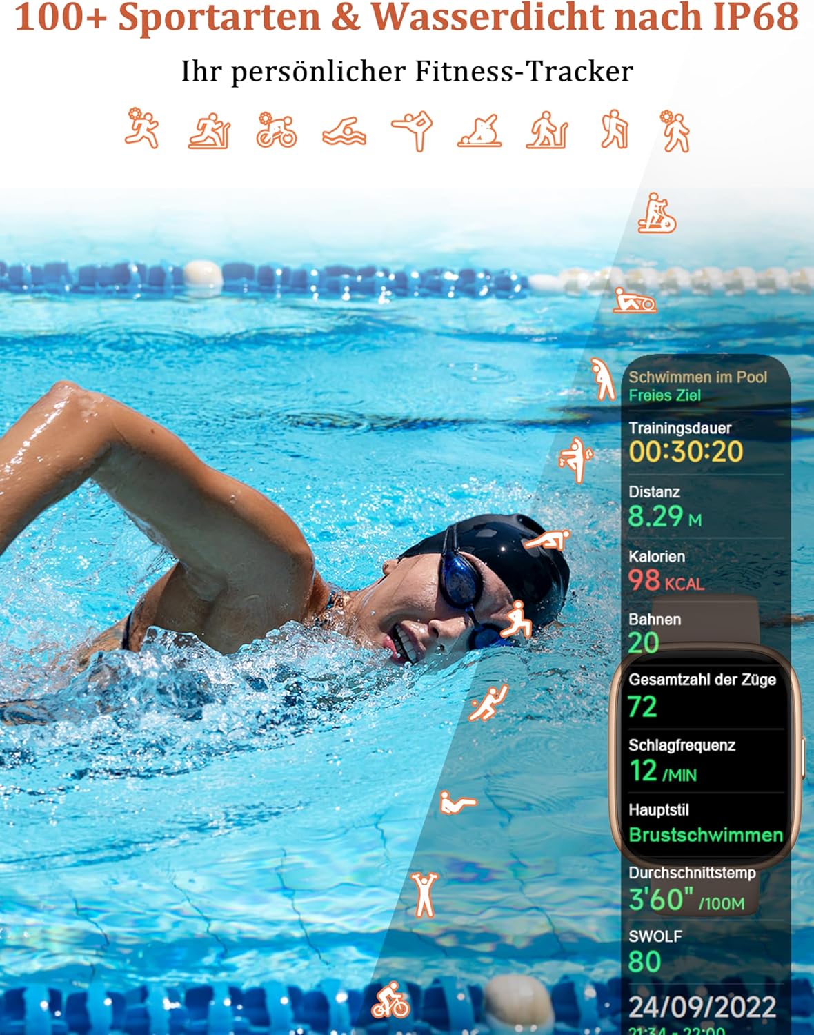 • Многофункционален: този спортен часовник поддържа над 100 спортни режима, включително бягане, туризъм, баскетбол, гребане, катерене, колоездене, футбол, йога и други. Фитнес тракерът IDW26 автоматично разпознава бягане и ходене и точно записва калории, крачки и разстояния. Неговият водоустойчив клас IP68 ви позволява да го използвате с увереност, докато плувате. Не го носете по време на горещи вани, сауни или гмуркане.