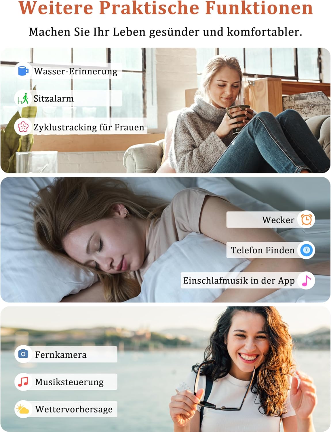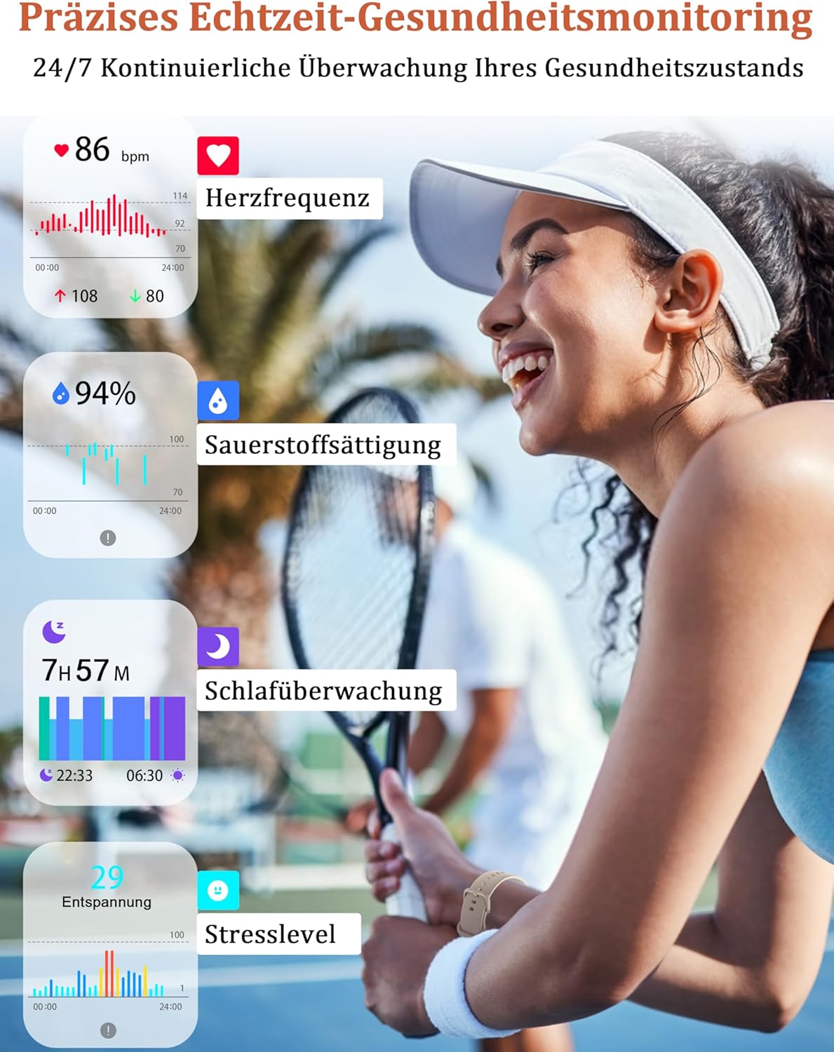 • 23/10% здравословно състояние: Възползвайте се от цялостно управление на здравето с непрекъснато наблюдение на сърдечната честота и кислорода в кръвта. Този смарт часовник може да следи нивата на стрес и ефективно да го управлява с дихателни упражнения. Автоматичното наблюдение на съня може да анализира и подобри качеството на съня ви. Допълнителни функции, като наблюдение на менструалния цикъл, напомняния за пиене на вода и предупреждения за активност, правят този часовник добър спътник в здравето.