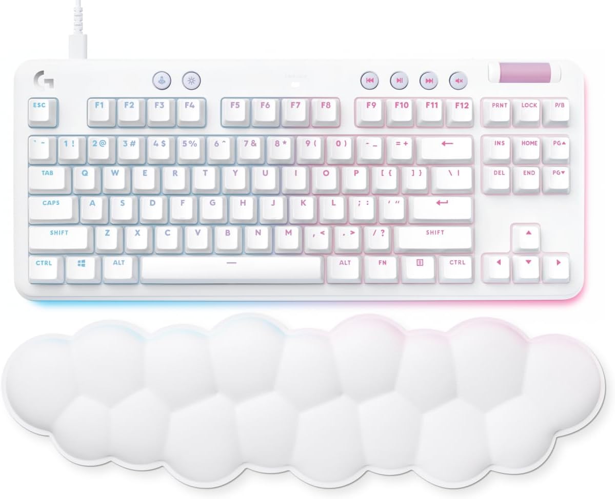 • Комфорт, нежен като облак: Потопете се в мечтателния бял дизайн на G715 и удобната му опора за длани във формата на облак; компактната механична клавиатура TKL и регулируемата височина осигуряват комфортно игрово изживяване през целия ден.