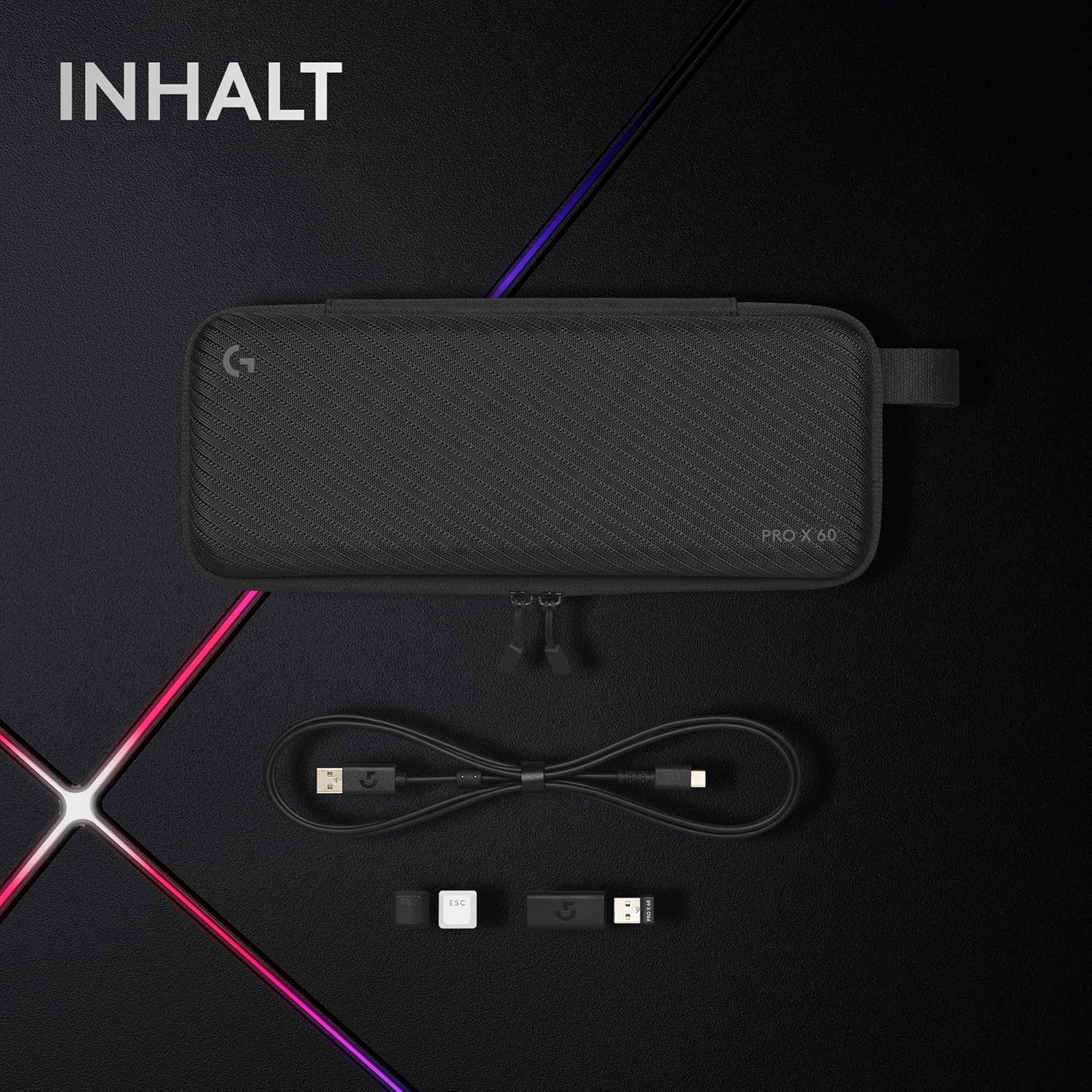 • Съдържание: Безжична геймърска клавиатура PRO X 60, безжичен USB адаптер LIGHTSPEED, кабел за зареждане и данни USB-A към USB-C (1,8 м), капачки за клавиши Logitech G, калъф за пътуване, ръководство за употреба