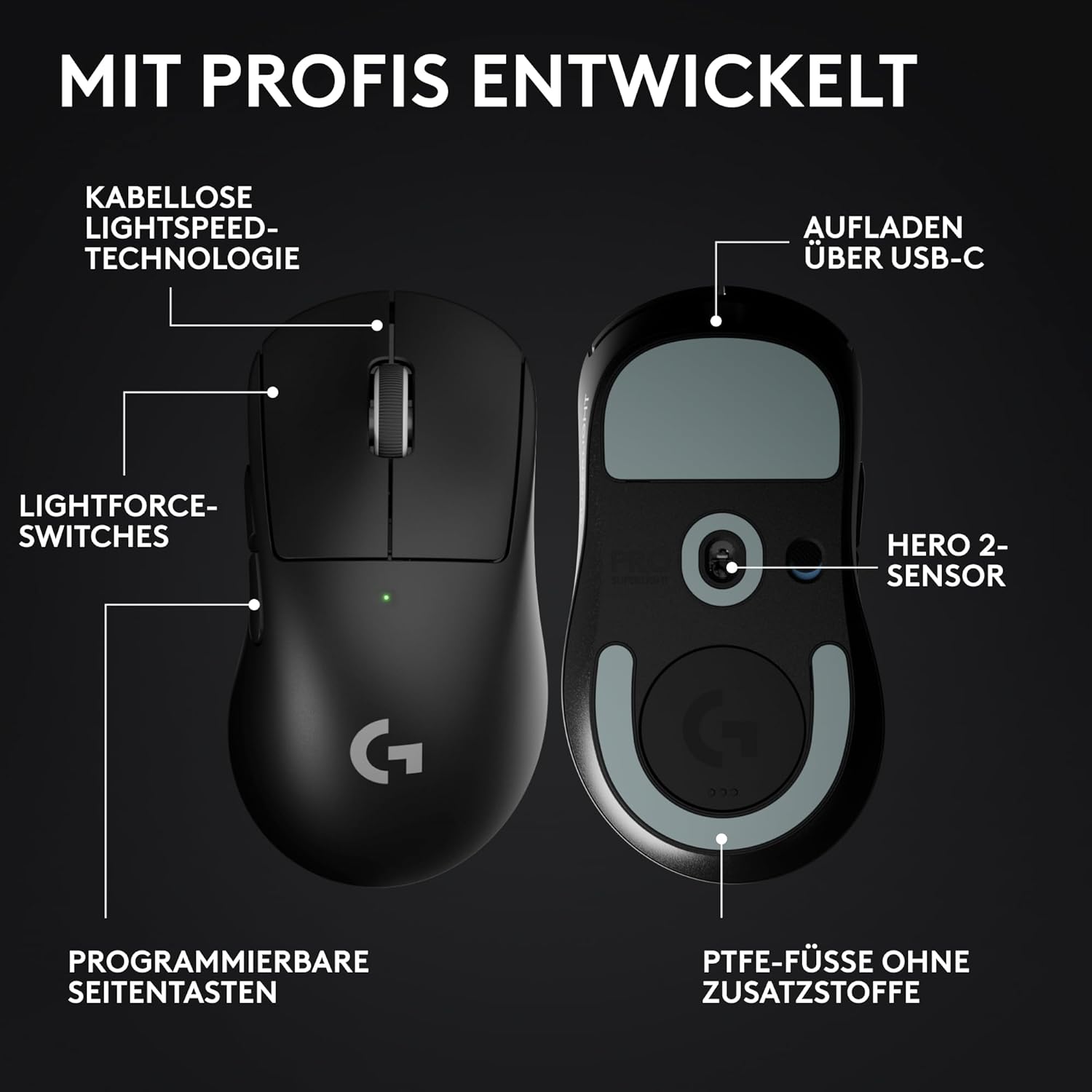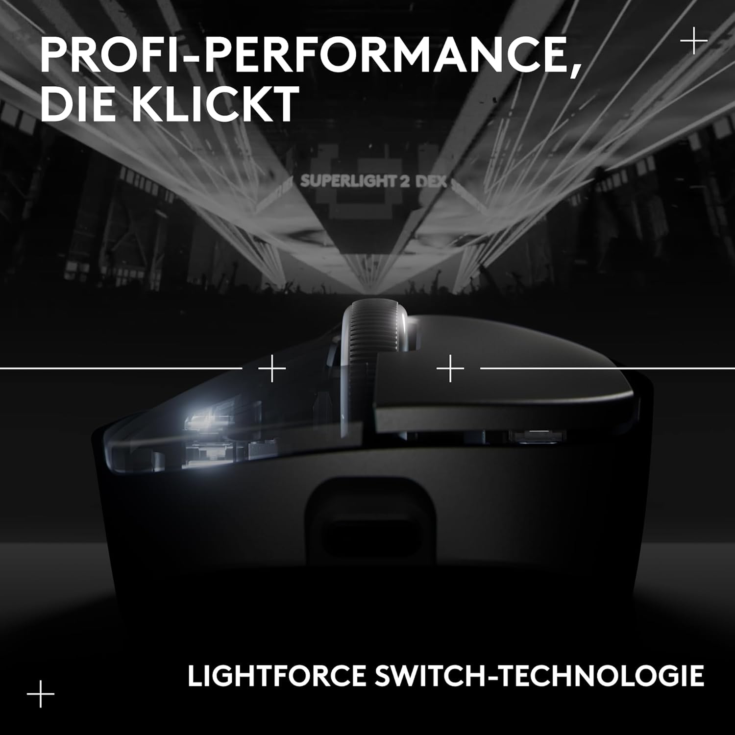 • Logitech PRO X SUPERLIGHT 2, нашата награждавана безжична мишка, сега е още по-добра от всякога: честота на семплиране 8 kHz, зареждане през USB-C, 95 часа живот на батерията и съвместимост с POWERPLAY при тегло от 60 g.