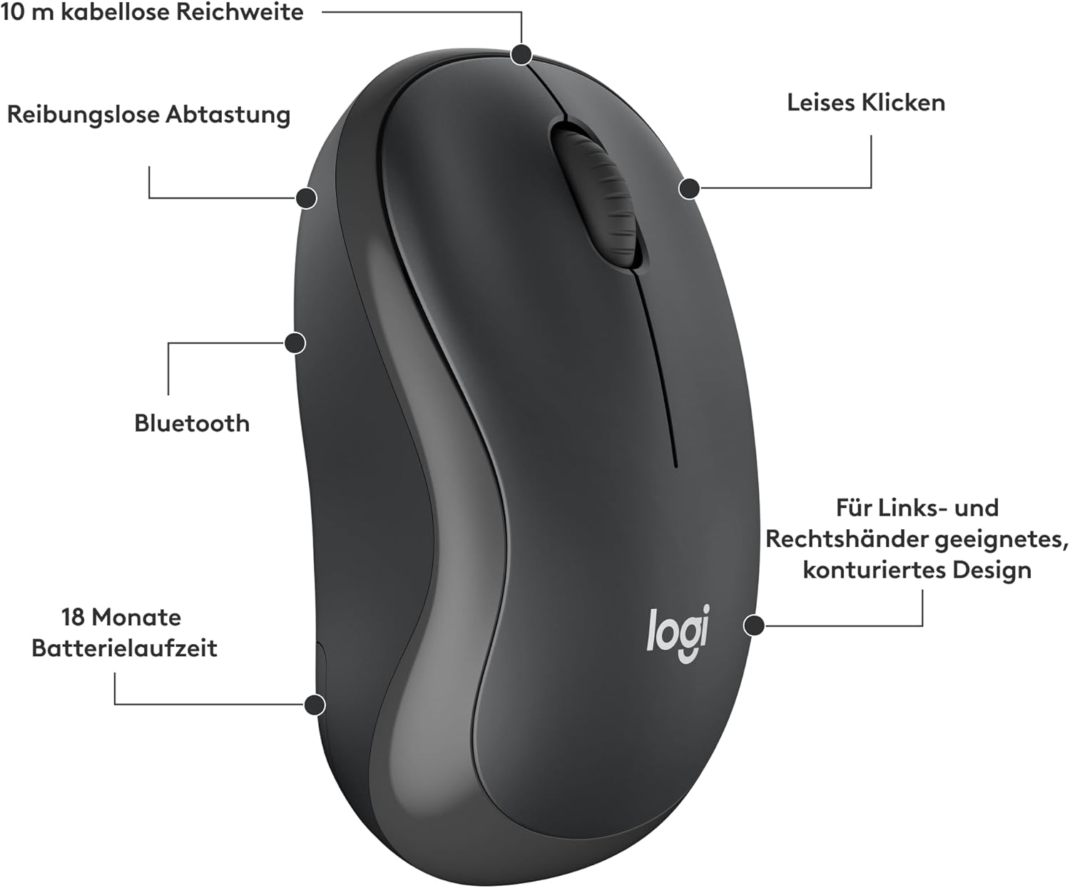 Logitech M240 безшумна Bluetooth мишка, безжична, компактна, мобилна, плавно проследяване, 18 месеца батерия, за Windows, MacOS, ChromeOS, съвместима с PC, Mac, лаптоп, таблети - графит
