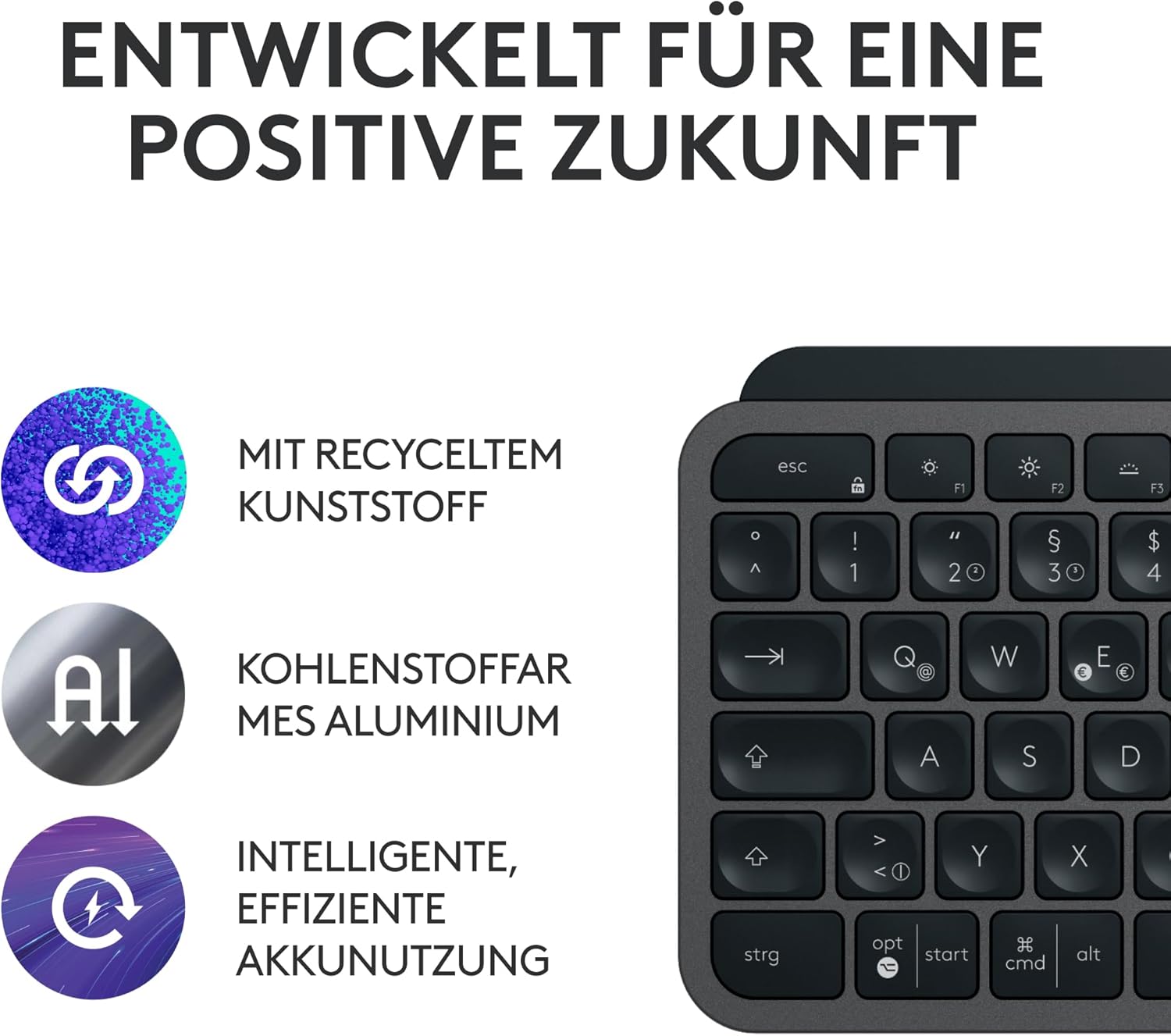 • MX Keys S и MX Master 3S съдържат сертифицирана рециклирана пластмаса след употреба - MX Master 3S (27% за графит, 22% за бледосив); MX Keys S (26% за графит и 11% за бледосив) (8)