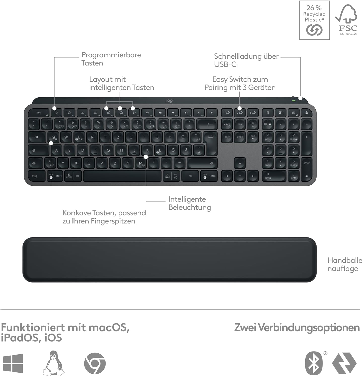 Logitech MX Keys S Combo: Мощна безжична клавиатура и мишка с поставка за длани, персонализируемо осветление, бързо скролиране, Bluetooth, за Windows/Linux/Chrome/Mac - графит, немска QWERTZ подредба