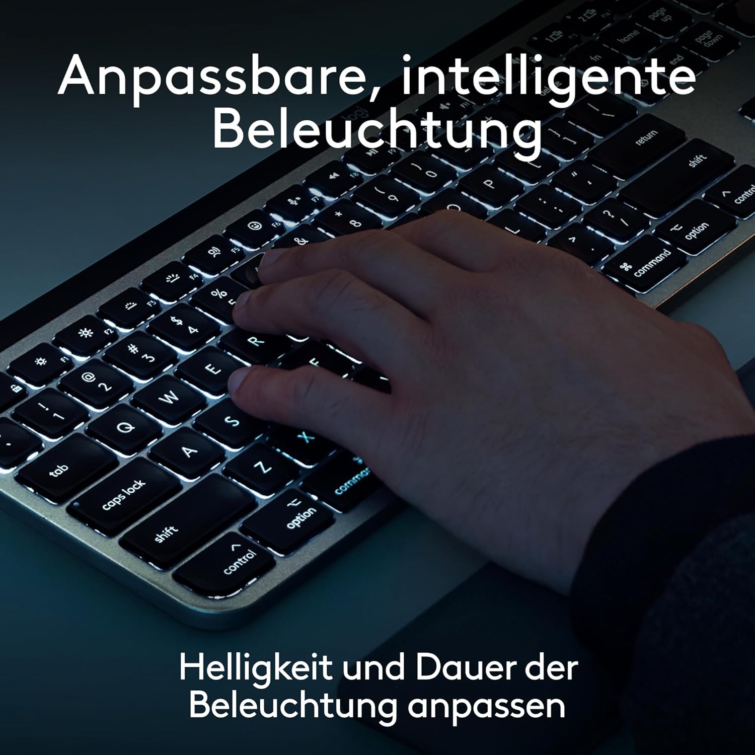 Logitech MX Keys S Combo за Mac, безжична клавиатура/мишка с поставка за длани, подсветена клавиатура, мишка с бързо скролиране, Bluetooth USB C за MacBook Pro/MacBook Air/iMac/iPad, QWERTZ DE - Сив